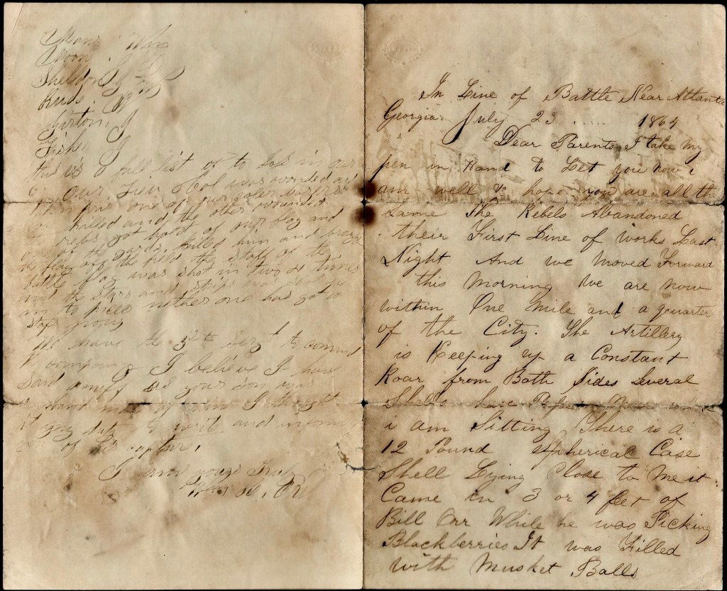 We have had a busy, hard campaign. We have been through some of the worst places that you ever saw. I am sure that if they cannot hold the places that they have passed through, they cannot hold any at all. The Reb prisoners that we take all say if we get Richmond & Atlanta, they will not fight anymore. I hope that is so, but the thing is awfully mixed. A man cannot tell. I shall think they are going to [ ] when they lay down their arms.