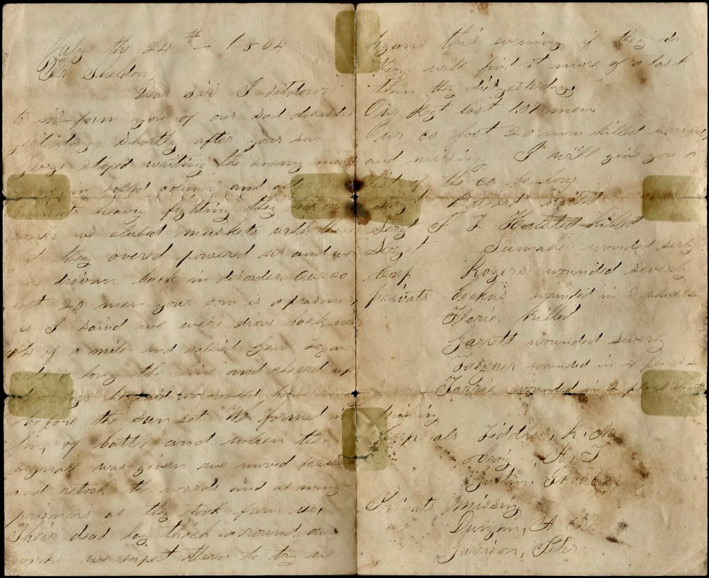 Well, I guess we have nothing to do today so I will try and fill these two pieces of sheets with something. It is the best I can do for paper—everything is so scarce and no sutlers are allowed here at present. I had to beg this from the Christian Commission. We expect to be paid off in a day or two but the money won’t do us any good here as there is nothing here to sell that I want. Stewart Adams was badly mistaken when he said that we could get things cheaper here than we could at home. We can get most anything we want when the settlers are with us, but we have to pay about three times for nearly everything and I think Adams knew it very well.