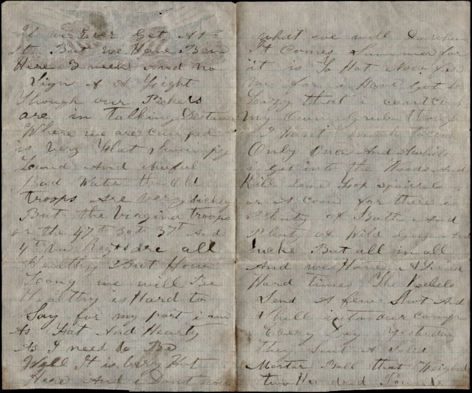 I hear that Capt. McCoy has got a furlough and is coming home. From reports, they must have had a pretty hard time on their trip to Lynchburg. I would have liked very much to have attended the Sanitary Fair at Wheeling. I judge it was a nice affair from what I hear of it. We spent our Fourth [of July] in camp taunting the rebels with our bands. They don’t like our music a bit. Our bands play the National airs every evening and then the boys raise a cheer which is replied by a shower of musket balls from the rebel skirmish line.
