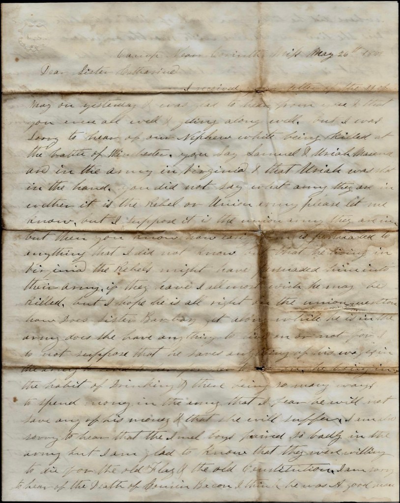 I received your letter of the 11th of May yesterday & was glad to hear from you & that you were all well & getting along well, but I was sorry to hear of our nephew White being killed at the Battle of Winchester. You say Samuel & Uriah Massena are in the army in Virginia and that Uriah was shot in the hand. You did not say what army they are in—whether it is the Rebel or Union army. Please let me know, but I suppose it is the Union army they are in. But then you know how easily Sam is persuaded to anything that I did not know but that he living in Virginia, the rebels might have persuaded him into their army. If they have, I almost wish he may be killed, but I hope he is all right on the Union question. How does sister Barbara get along while he is in the army? Does she have anything to live on or not For I do not suppose that he saves anything of his wages in the army to send home for her to live on, he being in the habit of drinking & there being so many ways to spend money in the army that I fear he will not save any of his money & that she will suffer.