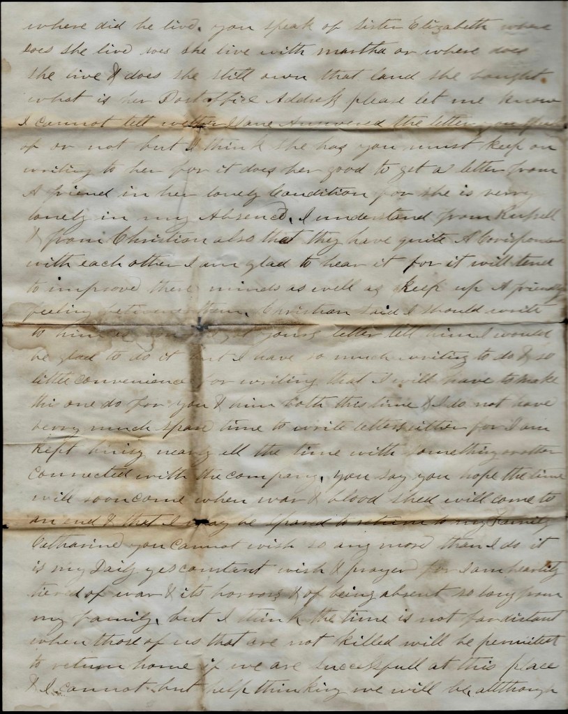 I understand from Russell and from Christian also that they have quite a correspondence with each other. I am glad to hear it for it will tend to improve their minds as well as keep up a friendly feeling between them. Christian said I should write to him as soon as I got your letter. Tell him I would be glad to do it but I have so much writing to do & so little convenience for writing that I will have to make this one do for you & him both this time & I do not have very much spare time to write letters either for I am kept busy nearly all the time with one thing or another connected with the company. You say you hope the time will soon come when war and bloodshed will come to an end & that I may be spared to return to my family. Catharine, you cannot wish so anymore than I do. It is my daily—yes, constant wish & prayer for I am heartily tired of war & its horrors & of being absent so long from my family. But I think the time is not far distant where those of us that are not killed will be permitted to return home if we are successful at this place & I cannot but help thinking we will be although I expect it will be a desperate struggle if they fight at all & I suppose they will. But I cannot tell when it will come off any more than you can.