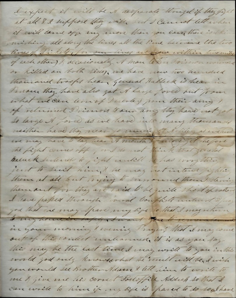 There is skirmishing all along the lines all the time between the two lines of pickets for our lines are now within two miles of each other and occasionally a man taken prisoner, wounded or killed on both sides. We have now two hundred thousand troops here. Gen. Halleck is here in person. They have also got a large force but from what we can learn of deserters from their army & of returned prisoners to our army, they have not got so large a force as we have into many thousands. Neither have they near so much artillery as we have. We may have to lay here a month or move yet before the fight comes off for I do not think that General Halleck intends to fight until he has everything just to suit him & he may not intend fighting them at all but trying to surround them and starving them out for they are said to be quite short of rations.