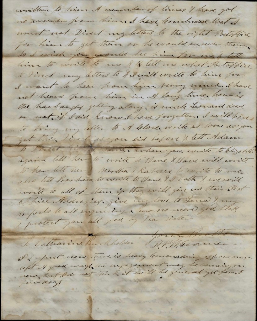 How is the Harbough’s getting along? Is Uncle Leonard dead or not? If I did know, I have forgotten. I will have to bring my letter to a close. Write as soon as you get this. Direct as you did before & tell Adam to direct in the same. When you write to Elizabeth again, tell her to write to Jane and Jane will write to her. Tell her and Martha and Rebecca to write to me. Also tell Barbara to write to Jane & I both & we will write to all of the, if they will give us their post office addresses. Give my love to Lena and my respects to all enquiring. No more. God bless & protect you all. Goodbye dear sister.