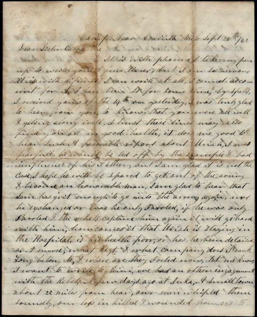 We had another engagement with the Rebels a few days ago at Iuka—a small town about 22 miles from here. Our men whipped them soundly. Our loss in killed and wounded from 150 to two hundred, killed about 70. Rebel loss 800 to 1,000 killed & wounded, killed about 300—at least our forces buried two hundred and seventy of the Rebel dead & of course they had not found them all at that time yet. Our regiment was not in the fight. Neither was our Brigade but the balance of our Division was there but was not engaged. It is a wonder that we were not in it for they have kept our regiment in the advance whenever there was any trouble on hand ever since we left Pittsburg Landing. But I am not sorry at all that we were not in it. I have been in all the fights that I care about being in.