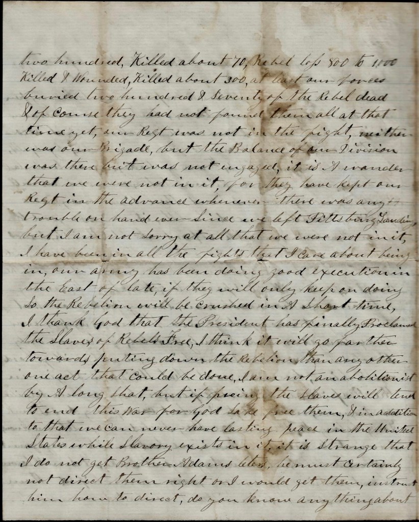Our army has been doing some good execution in the East of late. If they will only keep on doing so, the Rebellion will be crushed in a short time. I thank God that the President has finally proclaimed the slaves of Rebels free. I think it will go farther towards putting down the rebellion than any other one act that could be done. I am not an abolitionist by a long shot, but if freeing the slaves will tend to end this war, for God sake, free them, & in addition to that, we can never have lasting peace in the United States while slavery exists in it.