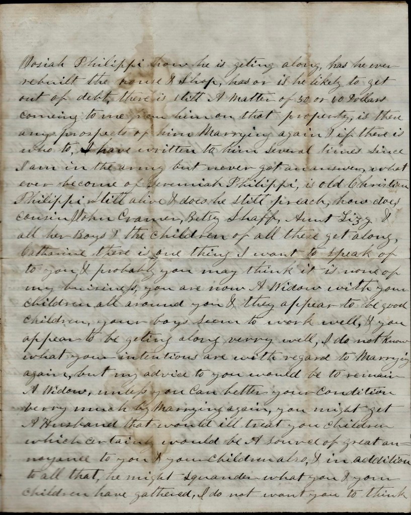 It is strange that I do not get brother Adam’s letters. He must certainly not direct them right or I would get them. Instruct him how to direct. Do you know anything about Josiah Philippi—how he is getting along? Has he ever rebuilt the house and shop, has or is likely to get out of debt? There is still a matter of 50 or 60 dollars coming to me from him on that property. Is there any prospects of him marrying again & if there is, who to? I have written to him several times since I am in the army but never got an answer. What ever became of Jeremiah Philippi? Is old Christian Philippi still alive and does he still preach? How does cousin John Cramer, Betty Shoff, Aunt Lizzy, & all her boys & the children of all these get along?