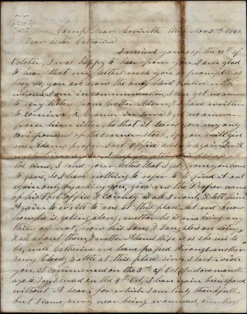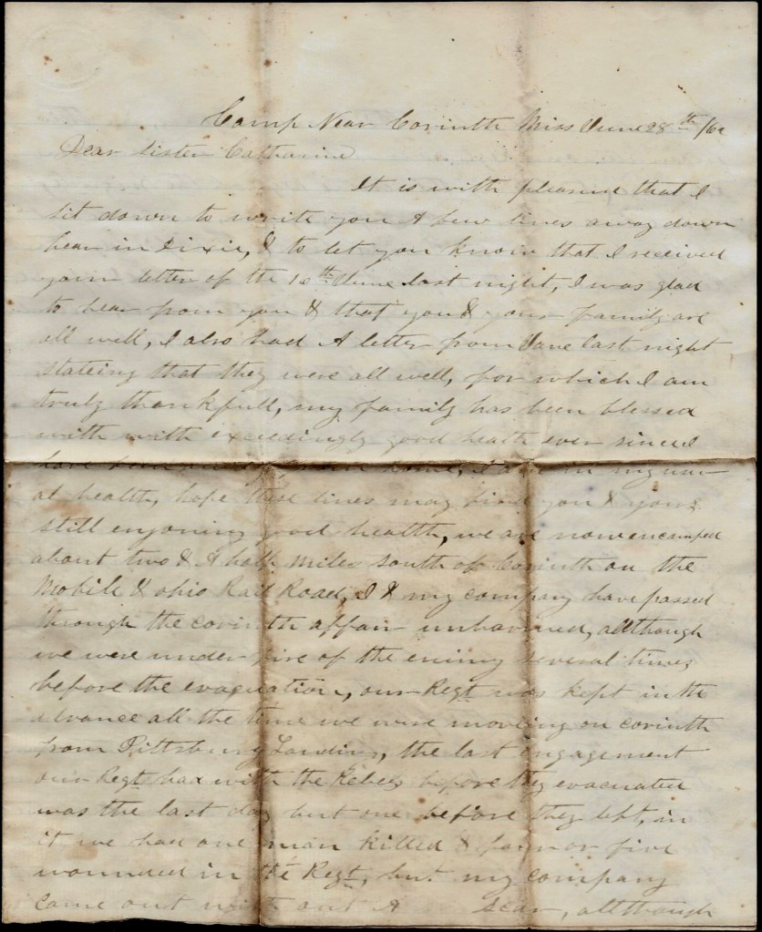 We started on a march the next morning after I wrote to you last and have been marching ever since. We went from Baldwyn to Corinth and yesterday was a week ago we got up there and attacked the enemy in their breastworks Friday morning when we drove them back, captured several pieces of artillery, and drove them back into town. Our loss was very heavy on Friday and Friday night we lay in line of battle on the side of the railroad right at the edge of town. Saturday morning we made a charge on the enemy and we had to charge another breastwork and battery which we had to face for about a half of a mile right through an open field which we done and taken it with much loss of men but we taken it and drove them back into town into their forts where they fought us rapidly and we had to charge them again and it was about three or four hundred yards from the breastworks to the fort right in as close a place as you most ever saw. And they had one fort on our right and a heavy battery on our left playing on us from both sides and one fort in front pouring grape canister [ ] and cannon balls in on us from both sides and in front, almost as thick as hail which we had to march through to the fort, which we did, and drove them back again into another fort that they had where they fought us for some time. And [then] they thought they would charge us and run us back but we held our position against them till we saw that their force was too strong for us when we was ordered to retreat, when we retreated back and I thought that they would get the last one of us but there was a few of us left that was left.