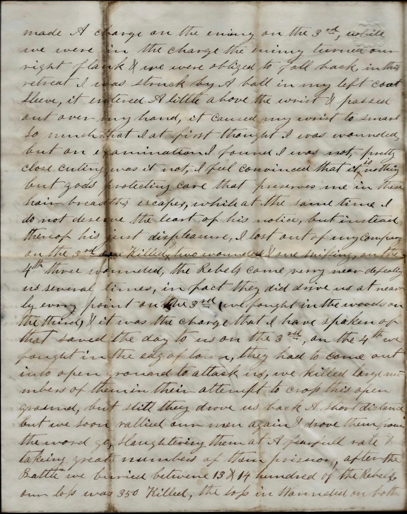 I lost out of my company on the 3rd, one killed, two wounded & one missing. On the 4th, three wounded. The Rebels came very near defeating us several times. In fact, they did drive us at nearly every point on the 3rd (we fought in the woods on the third) & it was the charge that I have spoken of that saved the day to us on the 3rd. On the 4th, we fought in the edge of town. They had to come out into open ground to attack us. We killed large numbers of them in their attempt to cross this open ground but still they drove us back a short distance. But we soon rallied our men again & drove them from the word go, slaughtering them at a fearful rate & taking great numbers of them prisoners. After the battle, we buried between 13 and 14 hundred of the Rebels. Our loss was 350 killed. The loss in wounded on both sides was about 5 to one killed. Our loss in prisoners was about 400. Theres was upwards of two thousand. We followed them 35 miles. Our advance followed 45 miles. In their hasty retreat, they threw away immense quantities of arms, ammunition, tents, wagons, cooking utensils, cannon, & in fact, the greater portion of all they had.