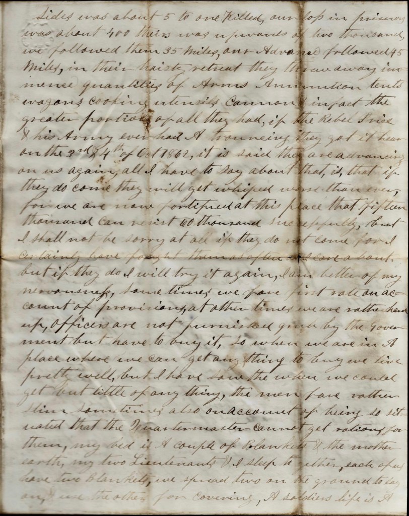 If the Rebel Price & his army ever had a trouncing, they got it here on the 3rd & 4th of October 1862. It is said they are advancing on us again. All I have to say about that is that if they do come, they will get whipped worse than ever for we are now fortified at his place [such] that fifteen thousand can resist 60 thousand successfully. But I shall not be sorry at all if they do not come for I certainly have fought them as often as I care about. But if they do, I will try it again. I am better of my nervousness.