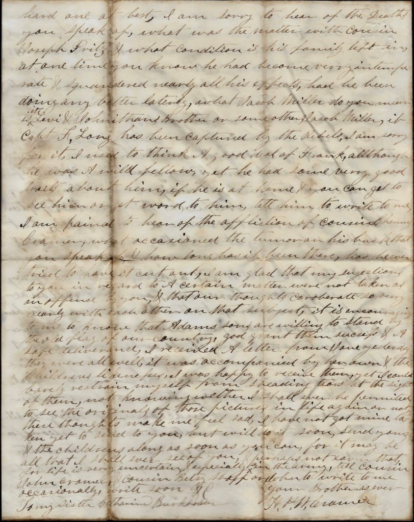 I am sorry to hear of the deaths you speak of. What was the matter with cousin Joseph Pritz & what condition is his family left in? At one time you know he had become very intemperate & squandered nearly all his effects. Had he been doing any better lately? What Jacob Miller do you mean? Is it Levi & Jonathan’s brother or some other Jacob Miller? If Capt. F. Long has been captured by the Rebels, I am sorry for it. I used to think a good deal of Frank although he was a wild fellow. Yet he had some very good traits about him. If he is at home & you can get to see him or get word to him, tell him to write to me. I am pained to hear of the affliction of cousin Henry Cramer. What occasioned the tumor on his back that you speak of & how long has it been there? Has he ever tried to have it cut out? I am glad that my suggestion to you in regard to a certain matter were not taken as an offense by you & that our thoughts corroborate so very nearly with each other on that subject. It is encouraging to me to know that Adam’s sons are willing to stand by the old flag of our country. God grant them success & a safe deliverance.
