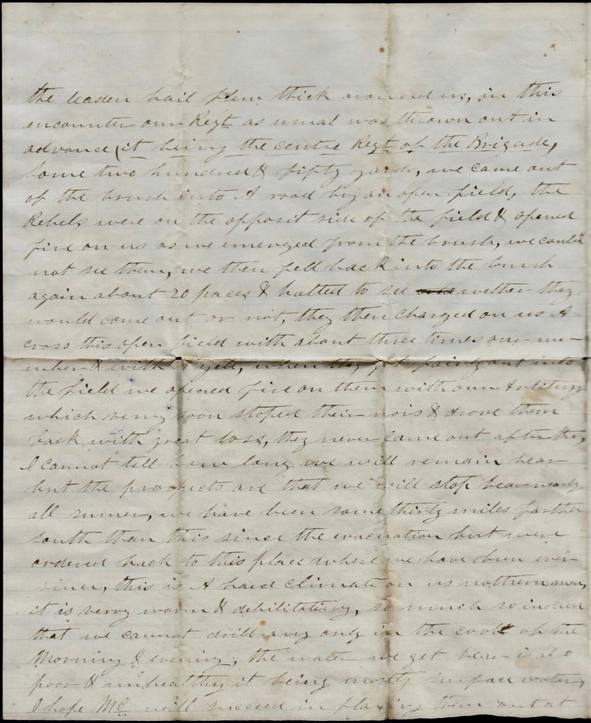 We are now encamped about two and a half miles south of Corinth on the Mobile & Ohio Railroad. I and my company have passed through the Corinth affair unharmed although we were under fire of the enemy several times before the evacuation. Our regiment was kept in the advance all the time we were moving on Corinth from Pittsburg Landing. The last engagement our regiment had with the Rebels before they evacuated was the last day but one before they left. In it we had one man killed & four or five wounded in the regiment, but my company came out without a scar, although the leaden hail flew thick around us. In this encounter our regiment as usual was thrown out in advance (it being the centre regiment of the Brigade) some two hundred and fifty yards. We came out of the brush into a road by an open field. The Rebels were on the opposite side of the field & opened fire on us as we emerged from the brush. We could not see them. We then fell back into the brush again about 20 paces and halted to see whether they would come out or not. They then charged on us across this open field with about three times our number & with a yell. When they got fairly out into the field, we opened fire on them with our artillery which very soon stopped their noise & drove them back with great loss. They never came out after this.