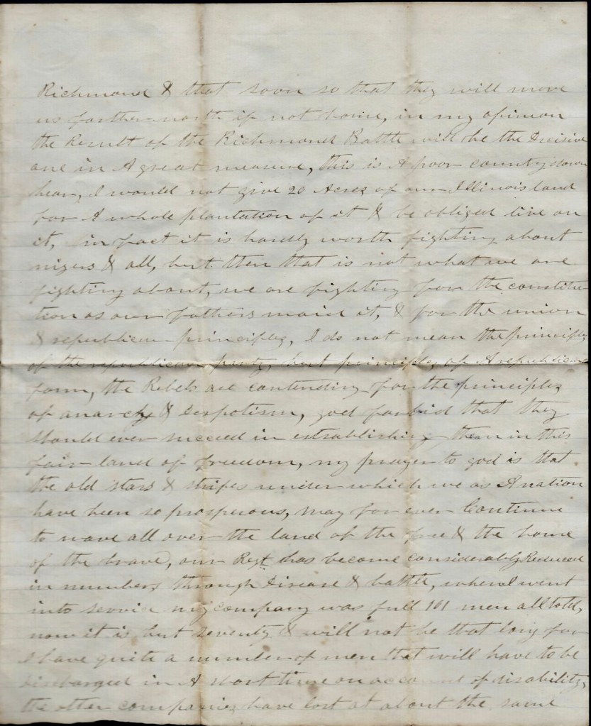 I hope Mc[Clellan] will succeed in flaxing them out at Richmond & that soon so that they will move us farther north, if not home. In my opinion, the result of the Richmond battle will be the decisive one in a great measure. This is a poor country down here. I would not give 20 acres of our Illinois land for a whole plantation of it & be obliged to live on it. In fact, it is hardly worth fighting about, niggers and all. But then that is not what we are fighting about. We are fighting for the Constitution as our father’s made it & for the Union & republican principles. I do not mean the principles of the Republican party, but principles of a republican form. The Rebels are contending for the principles of anarchy & despotism. God forbid that they should ever succeed in establishing them in this fair land of freedom. My prayer to God is that the Old Stars & Stripes under which we as a nation have been so prosperous may forever continue to wave all over the land of the free and the home of the brave.