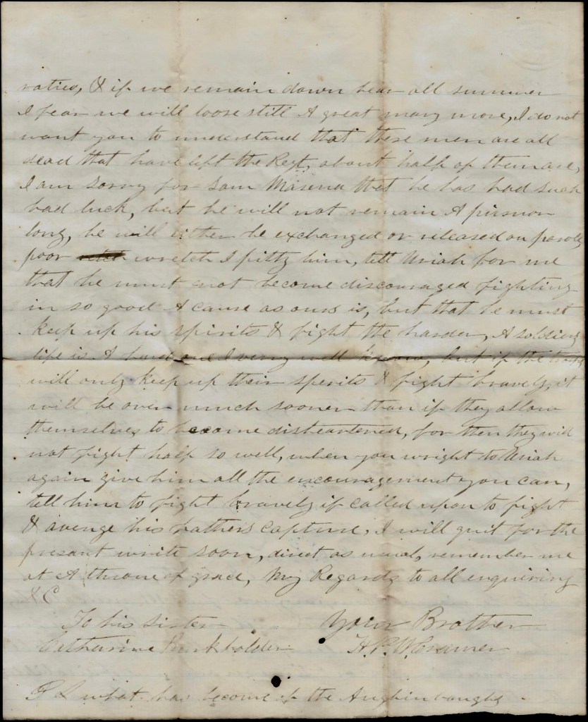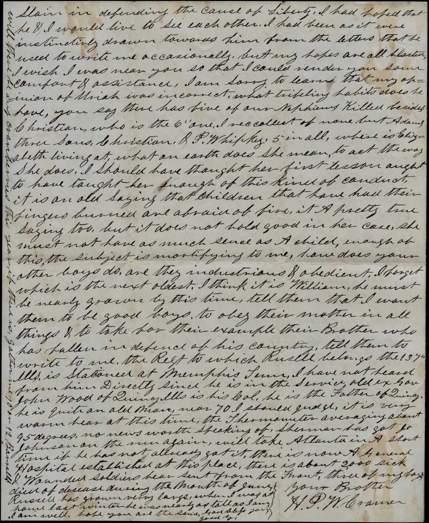 It is very warm here at this time—the thermometer averaging about 95 degrees. No news worth speaking of. Sherman has got Joe Johnston on the run again. Will take Atlanta in a short time if he has not already got it. There is now a General Hospital established at this place. There is about 2,000 sick and wounded soldiers here set from the front. Three of my boys died of disease during the month of June. Russell has grown very large. When I was at home last winter, he was nearly as tall as I am. I am well. Hope you are the same. God bless you. Goodbye. Your brother, — H. P. W. Cramer