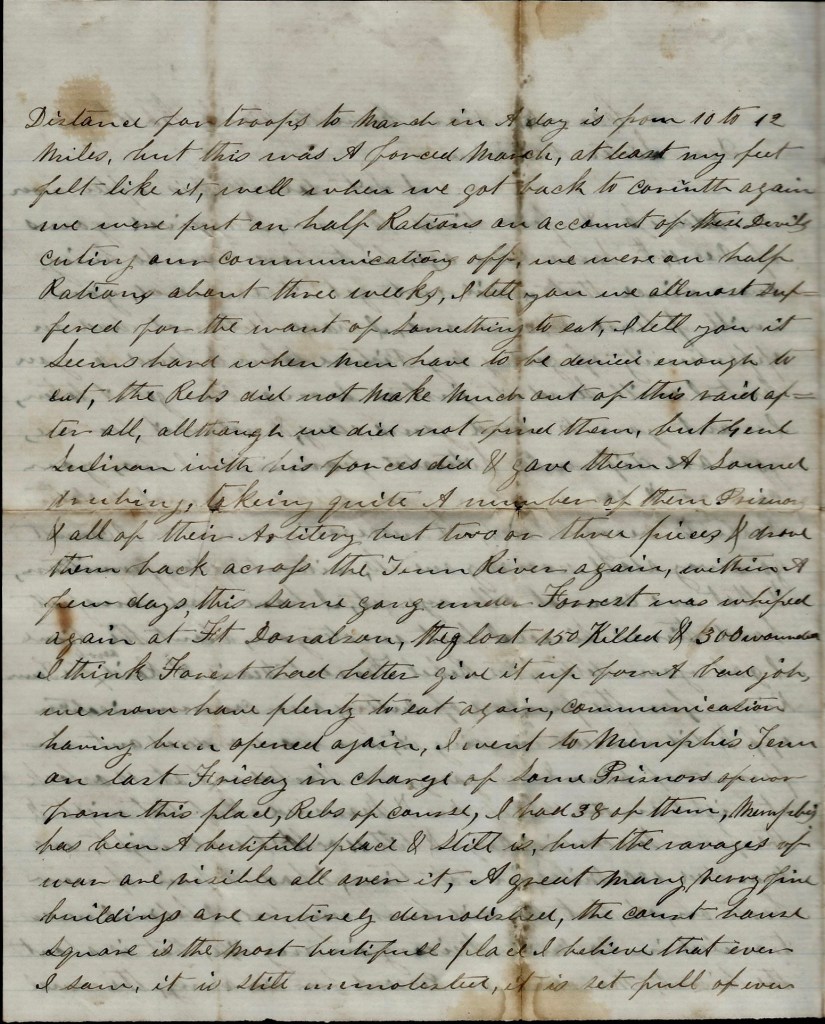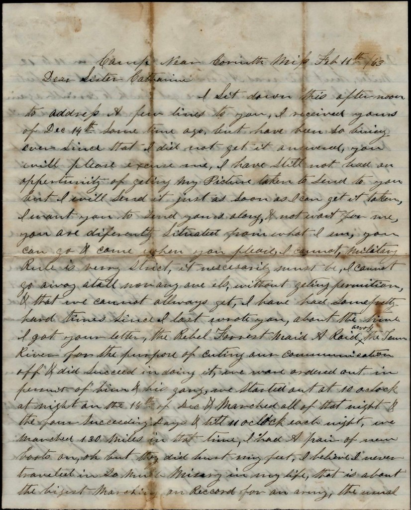 I have had some pretty hard times since I last wrote you. About the time I got your letter, the Rebel Forrest made a raid across the Tennessee River for the purpose of cutting our communication off & did succeed in doing it. We were ordered out in pursuit of him & his gang. We started out at 10 o’clock at night on the 18th of December & marched all of that night & the four succeeding days & till 11 o’clock each night. We marched 130 miles in that time. I had a pair of new boots on. Oh but they did hurt my feet. I believe I never traveled in so much misery in my life. That is about the biggest marching on record for an army. The usual distance for troops to arch in a day is from 10 to 12 miles, but this was a forced march—at least my feet felt like it. Well when we got back to Corinth again, we were put on half rations on account of the Devils cutting our communications off. We were on half rations about three weeks. I tell you, we almost suffered for the want of something to eat. I tell you, it seems hard when men have to be denied enough to eat. The Rebs did not take much out of this raid after all, although we did not find them. But Gen. Sullivan with his forces did and gave them a sound drubbing, taking quite a number of them prisoners and all of their artillery but two or three pieces, & drove them back across the Tennessee River again. Within a few days, this same gang under Forrest was whipped again at Ft. Donelson. They lost 150 killed & 300 wounded. I think Forrest had better give it up for a bad job.