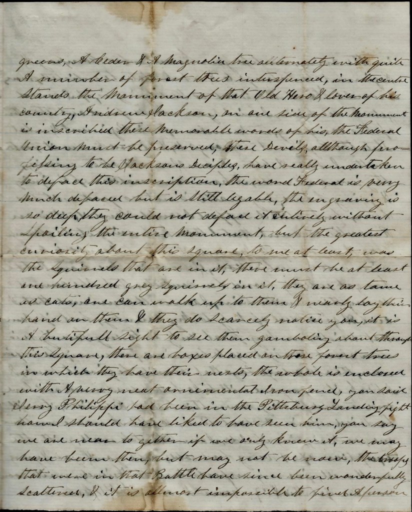 We now have plenty to eat again, communication having been opened again. I went to Memphis, Tennessee, on last Friday in charge of some prisoners of war from this place—Rebs of course. I had 38 of them. Memphis has been a beautiful place & still is, but the ravages of war are visible all over it. A great many very fine buildings are entirely demolished. The court house square is the most beautiful place I believe that ever I saw. It is still unmolested. It is set full of evergreens. A cedar and a magnolia tree are alternately [planted] with quite a number of forest trees interspersed. In the centre stands he monument of that Old Hero & lover of the country, Andrew Jackson. One one side of hte monument is inscribed these memorable words of his—“The Federal Union must be preserved.” These Devils, although professing to be Jackson’s disciples, have really undertaken to deface this inscription. The word “Federal” is very much defaced but is still legible. The engraving is so deep they could not deface it entirely without spoiling the entire monument. But the greatest curiosity about this square—to me at least—was the squirrels that are in it. There must be at least one hundred grey squirrels in it. They are as tame as cats. One can walk up to them & nearly lay their hand on them & they do scarcely notice you. It is a beautiful sight to see them gamboling about through this square. There are boxes placed on those forest trees in which they have their nests. The whole is enclosed with a very neat, ornamental iron fence.