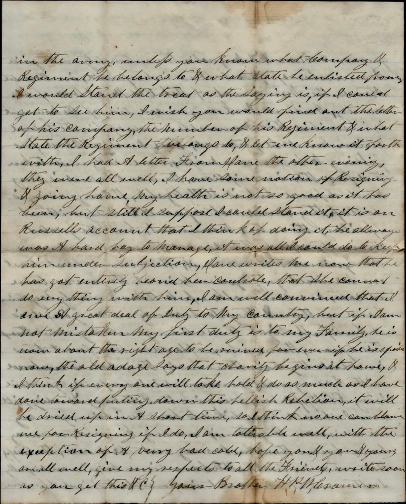 I had a letter from Jane the other evening. They were all well. I have some notion of resigning and going home. My health is not so good as it has been but still I suppose I could stand it. It is on Russell’s account that I think of doing it. He always was a hard boy to manage. It was all I could do to keep him under subjection. Jane writes me now that he has got entirely beyond her control—that she cannot do anything with him. I am well convinced that I owe a great deal of duty to my country, but if I am not mistaken, my first duty is to my family. He is now about the right age to be ruined forever if he is spoiled now. The old adage says that charity begins at home and I think if everyone will take hold & do as much as I have done toward putting down this hellish rebellion, it will be dried up in a short time, so I think no one can blame me for resigning if I do.