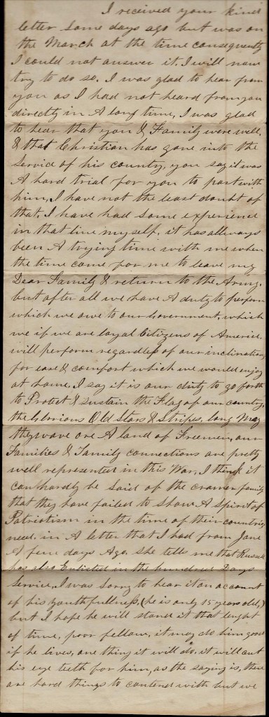I received your kind letter some days ago but was on the march at the time, consequently I could not answer it. I will now try to do so. I was glad to hear from you as I had not heard from you directly in a long time. I was glad to hear that you and your family were well and that Christian has gone into the service of his country. You say it was a hard trial for you to part with him. I have not the least doubt of that. I have had some experience in that line myself. It has always been a trying time with me when the time came for me to leave my dear family and return to the army, but after all we have a duty to perform which we owe to our government which we, if we are loyal citizens of America, will perform regardless of our inclination for ease and comfort which we would enjoy at home. I say it is our duty to go forth to protect and sustain the flag of our country—the glorious old Stars & Stripes, long may they wave over a land of freemen. Our families and family connections are pretty well represented in this war, I think it can hardly be said of the Cramer family that they have failed to show a spirit of patriotism in the time of their country’s need.