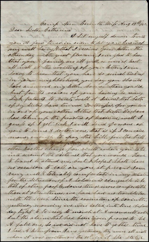 I sit myself down to write you a few lines in order to let you know of my well being & that I received your letter the other day with great pleasure. I am glad to hear that you and family are all well, or were at least all well at the writing of your letter. I am sorry to hear that you have so much sickness in your neighborhood. You say you should have answered my letter sooner that you did but for the reason of your having so many sick patients to visit. Well it seems that both of my sisters have turned Doctoresses for you said in one of your other letters that sister Barbara had taken up the practice of medicine. Well I guess if I get sick, I will send for someone of you to come and doctor me—that is, if I can raise money enough to pay the bill for the bill must be pretty high at the rate that other doctors charge for visits when you take into account the distance that you would have to travel to attend me. But I hope I shall have no occasion to call on you. At present I am very well & tolerably comfortable in my situation for the situation of a soldier is changeable like that of other people—sometimes more comfortable than at other times.