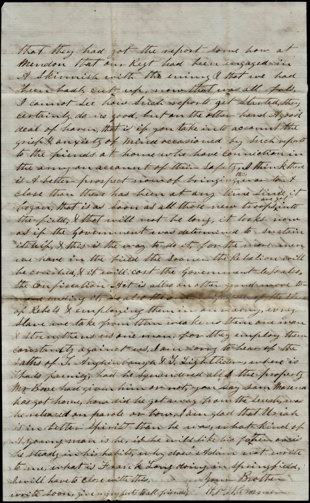 I had a letter from Jane yesterday. They were all well when it was written the 11th. In it they stated that they had got the report somehow at Mendon that our regiment had been engaged in a skirmish with the enemy & that we had been badly cut up. Now that was all false. I cannot see how such reports get started. They certainly do no good. But on the other hand a good deal of harm—that is, if you take into account the grief and anxiety of mind occasioned by such reports to the friends at home who have connections in the army on account of their safety. I think there is a better prospect now of bringing this war to a close than there has been at any time since it began—that is, soon as all those new troops are got into the field & that will not be long. It looks now as if the government was determined to sustain itself & this is the way to do it for the more men we have in the field, the sooner the rebellion will be crushed & it will cost the government less also. The Confiscation Act is also another grand move toward ending it; so also the emancipation of the slaves of Rebels & employing them in our army. Every slave we take from them weakens then one man and strengthens us one man for they employ them constantly against us.