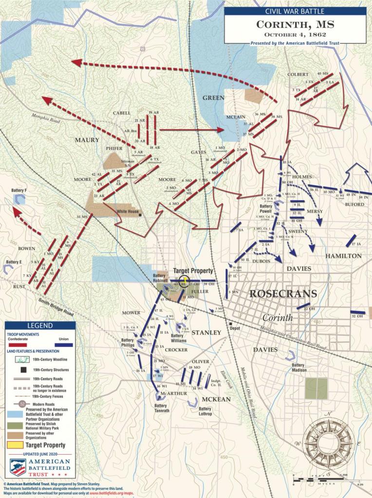 In the fighting at Corinth on October 4, 1862, the 37th Alabama charged on the Union right’s flank in the area under the red circle, driving the Union forces back as shown.