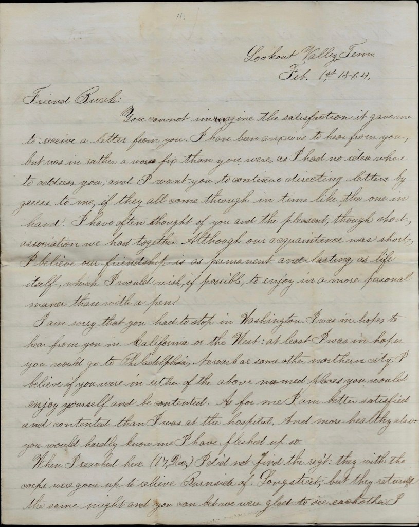 We are right in view of Lookout Mountain and three miles from Chattanooga and presume we will remain along this railroad this summer, as the western generals think Old Joe has won laurels enough. This is a very mountainous country and it is surprising how we drove the rebs off from them. Lookout is a second Gibraltar. I have been up on it and is only accessible on this side by the assistance of ladders; on the other side, a road leads up by tacking along the mountain. On the opposite side of the Valley is Raccoon Mountain. I was on this also the other day hunting. I only shot a rabbit and came very near getting a shot at a deer. Four other fellows that were hunting also shot at it but did not kill it. There is once in a while a bear and wild hog shot. There is hundreds of acres of woods on these mountains and plenty of the latter.