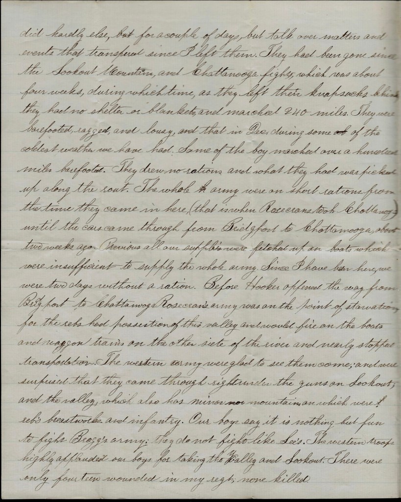 When I reached here (17 Dec.) I did not find the regiment. They with the Corps were gone up to relieve Burnside of Longstreet, but they returned the same night and you can bet we were glad to see each other. I did hardly else for a couple of days but talk over matters and events that transpired since I left them. They had been gone since the Lookout Mountain and Chattanooga fights, which was about four weeks, during which time, as they left their knapsacks behind, they had no shelter or blankets and marched 240 miles. They were barefooted, ragged, and lousy, and that in December during some of the coldest weather we have had. Some of the boys marched over a hundred miles barefooted. They drew no rations and what they had was picked up along the rout. The whole army were on short rations from the time they came in here (that is, when Rosecrans took Chattanooga) until the cars came through from Bridgeport to Chattanooga, about two weeks ago. Previous, all our supplies were fetched up on boats which were insufficient to supply the whole army. Since I have been here, we were two days without a ration. Before Hooker opened the way from Bridgeport to Chattanooga, Rosecrans’ army was on the point of starvation for the rebs had possession of this valley and wold fire on the boats and wagon trains on the other side of the river and nearly stopped transportation.