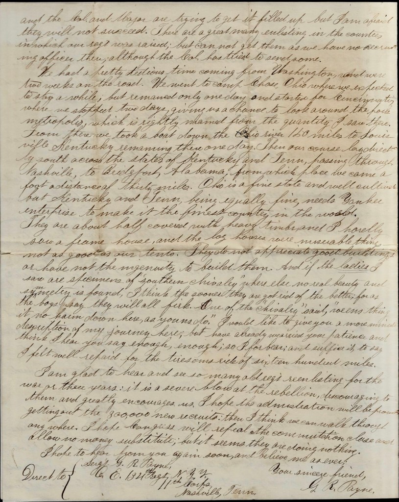 I am glad to hear and see so many old regiments reenlisting for the war or three years. It is a severe blow at the rebellion, discouraging to them and greatly encourages us. I hope this administration will be [successful] getting out the 800,000 new recruits; then I think we can walk through anywhere. I hope Congress will repeal the commutation clause and allow no money substitutes, but it seems they are doing nothing. I hope to hear from you again soon and believe me as ever, your sincere friend, — G. R. Payne