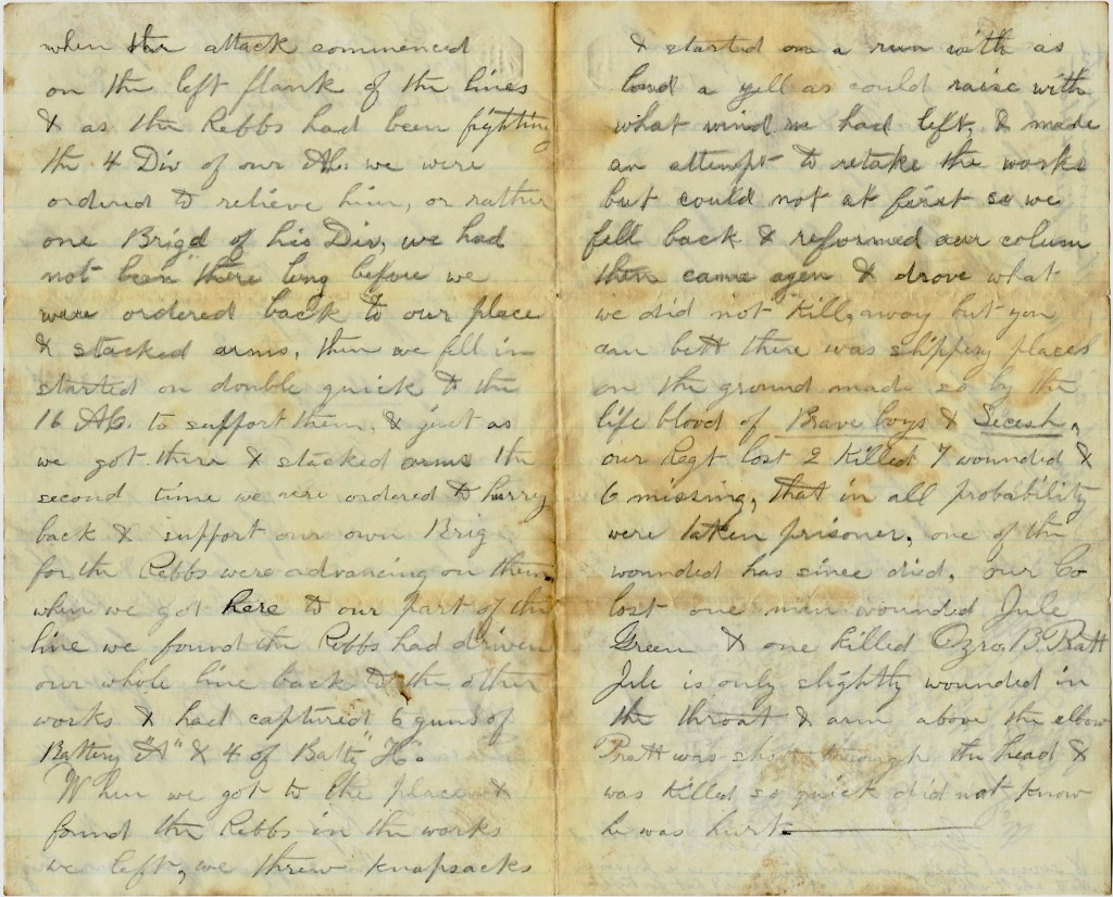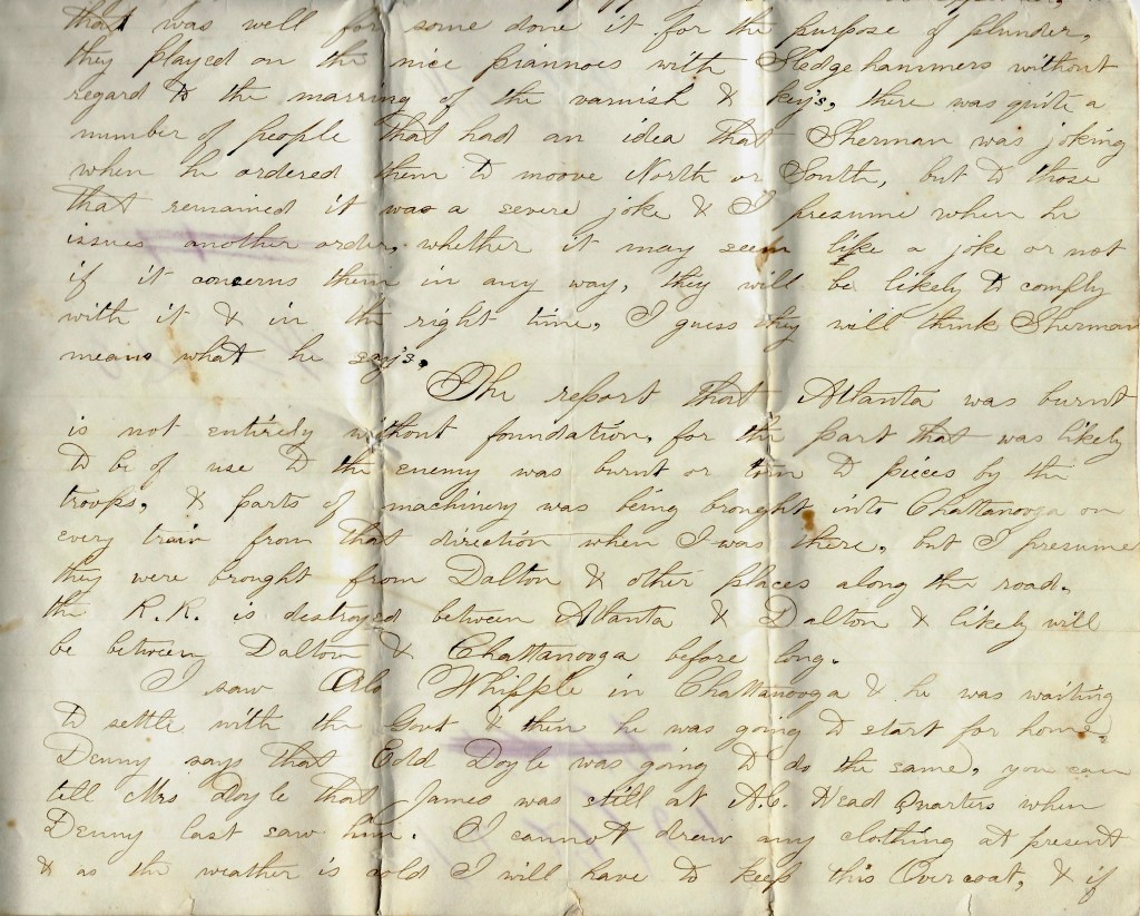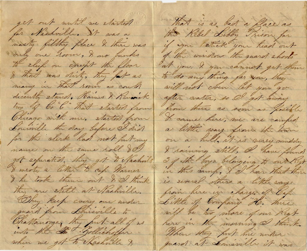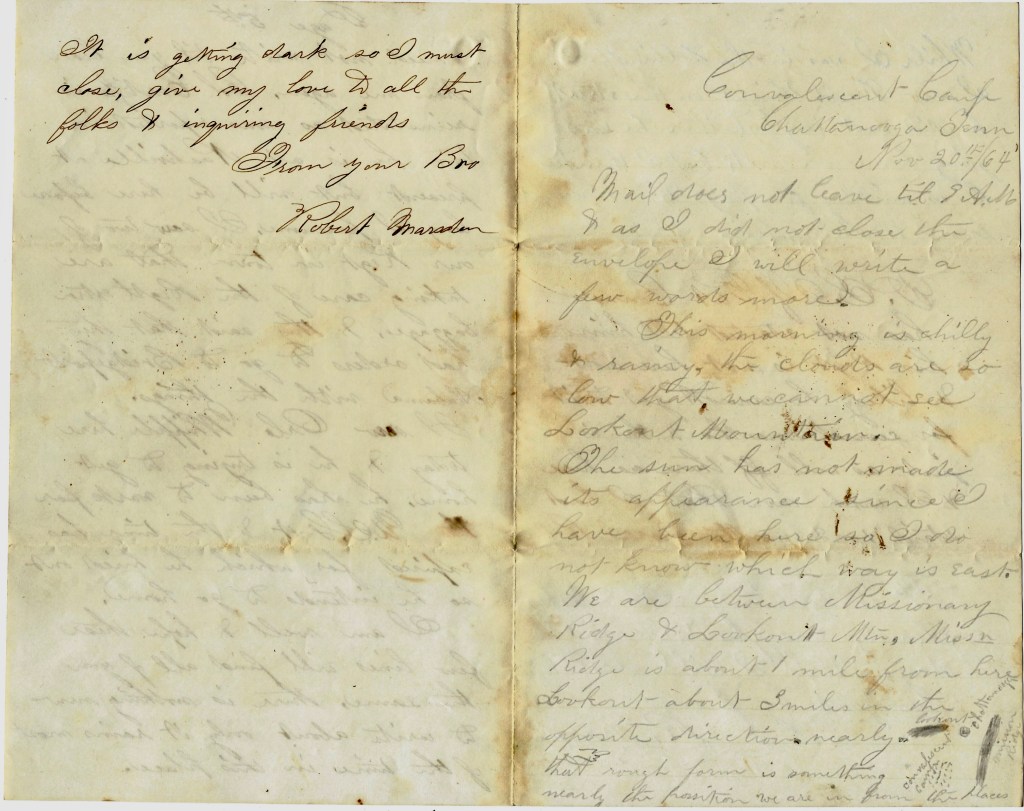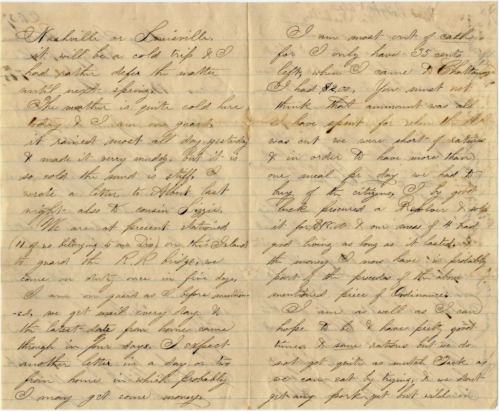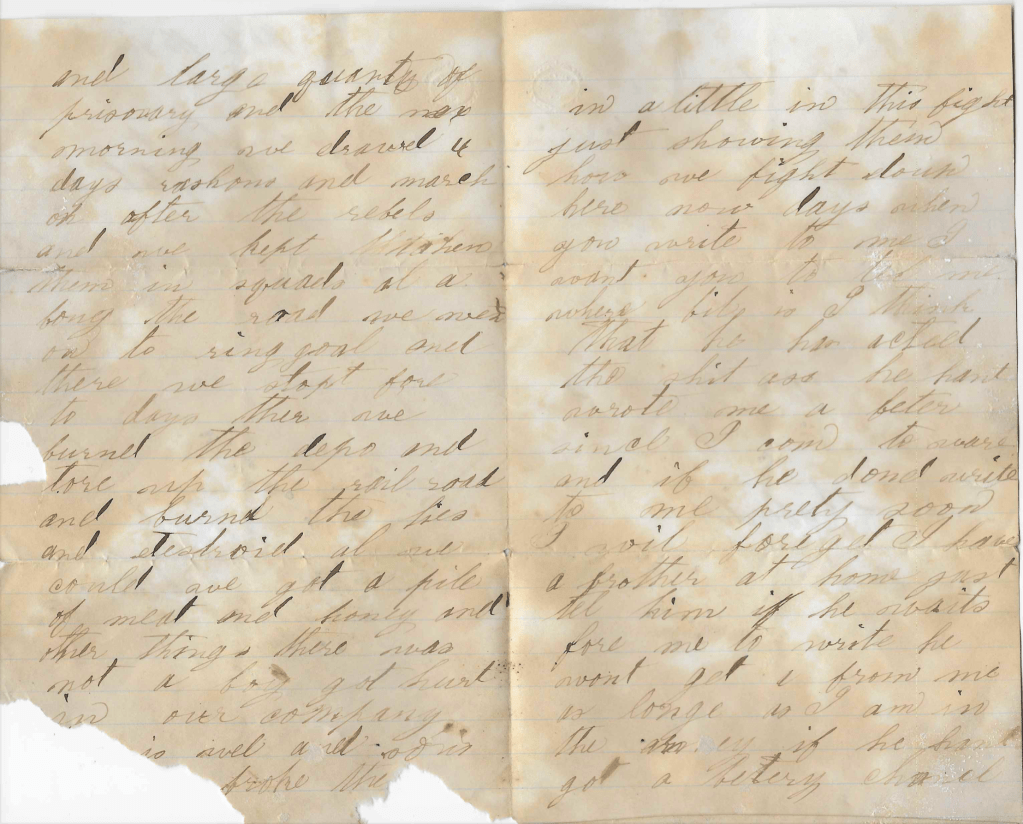 We have had another big fight since I wrote to you but I come out safe. We charged Lookout Mountain in one day and the next day we marched [ ] and charged in [ ] and there [ ] and large quantity of prisoners. And the next morning we drawed 4 days rations and marched off after the rebels and we kept taking them in squads all along the road. We went on to Ringgold and there we stopped for two days. There we burned the depot and tore up the railroad and burned the ties and destroyed all we could. We got a pile of meat and honey and other things. There was not a boy got hurt in our company. All is well and so is [paper torn]….broke the [ ] in a little in this fight just showing them how we fight down here now days.