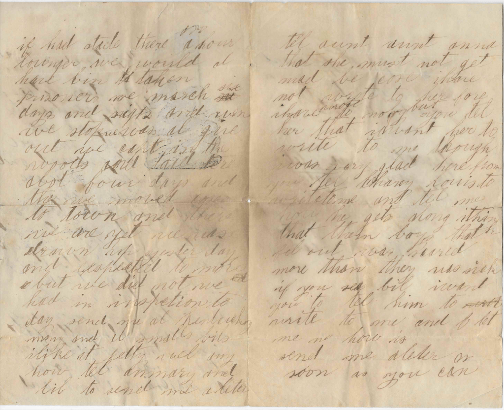 Send me all Kentucky money and in small bills. I like it pretty well. Anyhow, tell Aunt Mary and Lib to send me a letter. Tell Aunt Anna that she must not get mad because I have not wrote to her for I have wrote to nary but you. Tell her that I want her to write to me though. I was very glad to hear from you. Tell Charley Louis to write to me and tell me how he gets along. I think that them boys that fell out was scared more than they was sick. If you see Bill, I want you to tell him to write to me and let me know how he is.