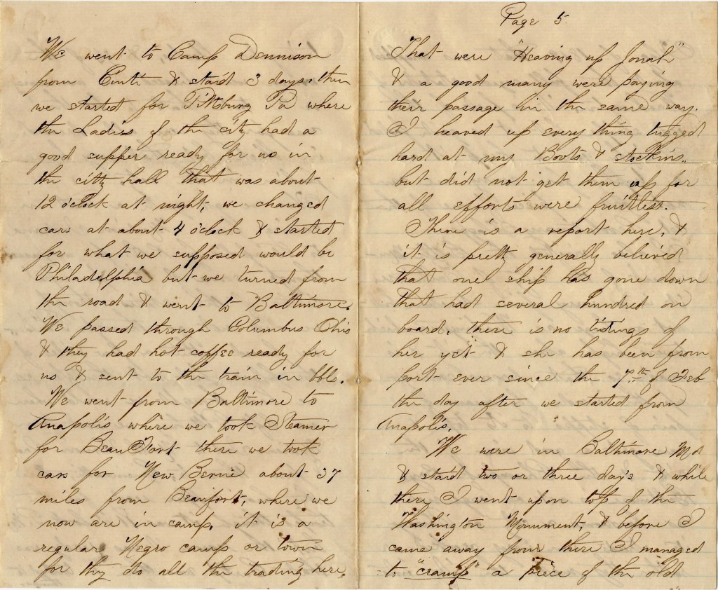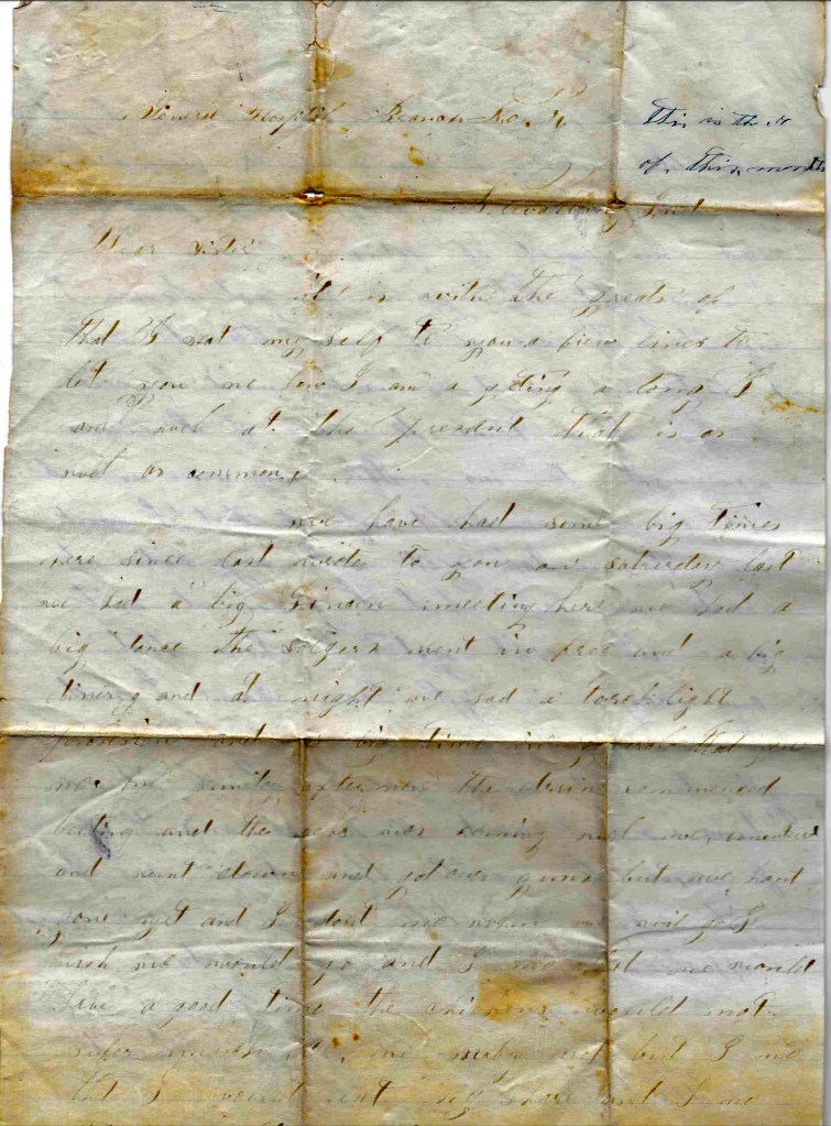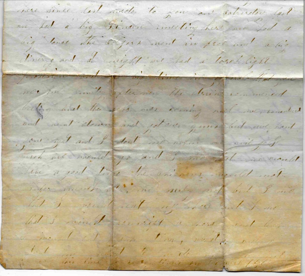 We have had some big times ere since last I wrote to you. On Saturday last we had a big Lincoln meeting here. We had a big dance. The soldiers went in free and a big dinner and at night we had a torchlight procession and it was as big time in general that you know, but suddenly, afterward the drum commenced beating and the Rebs was coming and we [ ] and went down and got our guns. But we ain’t done yet and I don’t know when we will. I wish we would go and I know that we would have a good time. The chickens would not suffer. Oh no, maybe not, but I know that I would eat my share and I know … [illegible]