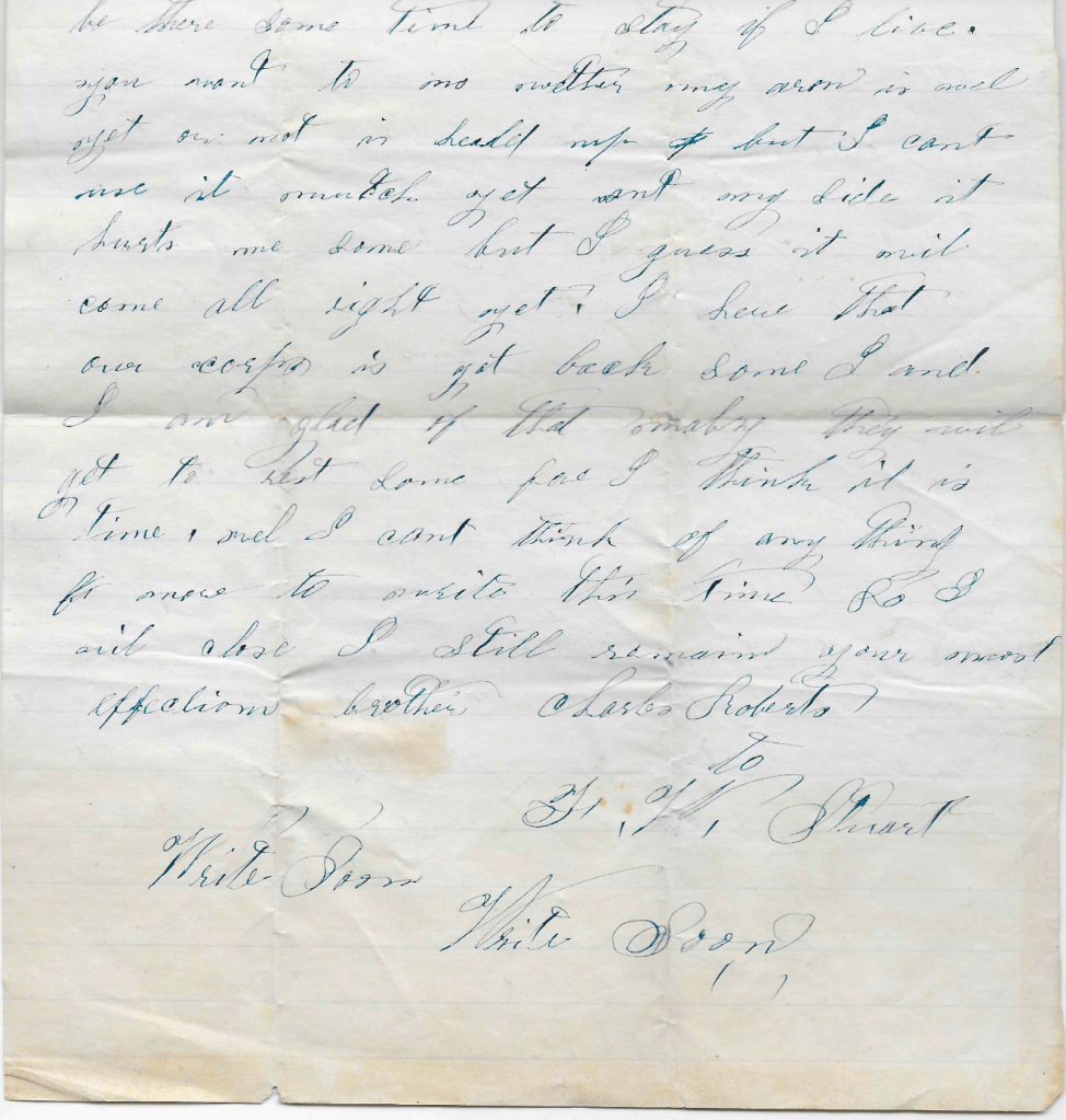 I hear that our Corps is got back and I am glad of that. Maybe they will get to rest some for I think it is time. Well, I can’t think of anything more to write this time so I will close. I still remain your most affectionate brother, — Charles Roberts