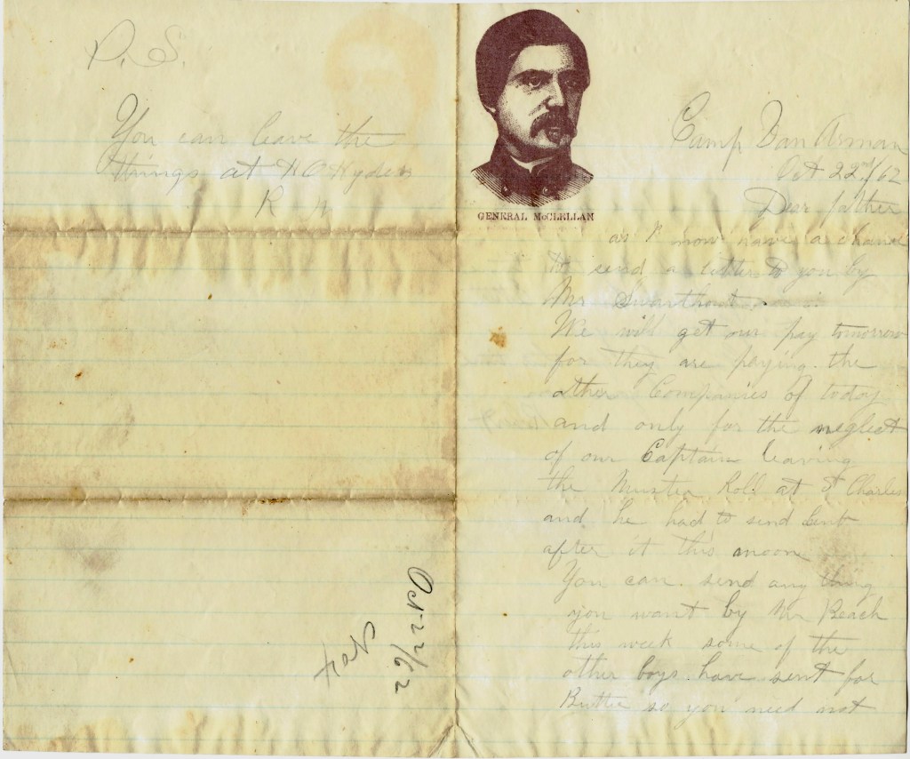 As I now have a chance to send a letter to you by Mr. Swarthout. We will get our pay tomorrow for they are paying the other companies off today and only for the neglect of our captain leaving the muster roll at St. Charles, and he had to send [our] lieutenant after it this noon. You can send anything you want by Mr. Beach. This week some of the other boys have sent for butter, so you need not send any for me this time.