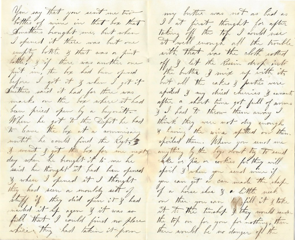 I have not received the box yet and am not certain when I will get it as the Christian Commission are getting but very few things up as the boat cannot bring full rations for the men here. We get but three large crackers, a few beans, and about a half pound of meal a day. You will please excuse this poor writing as my fingers are numb with cold.