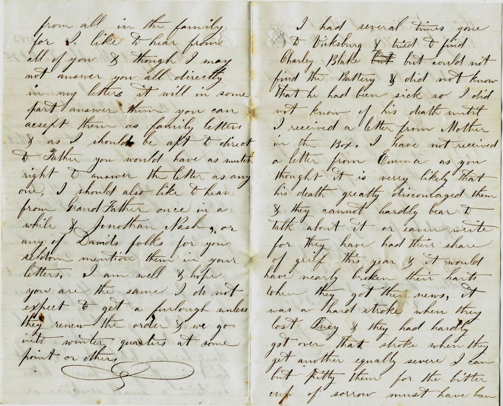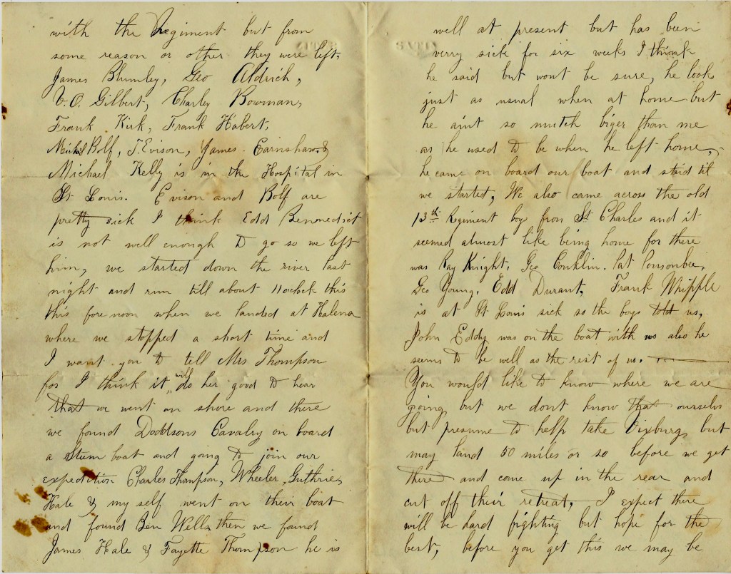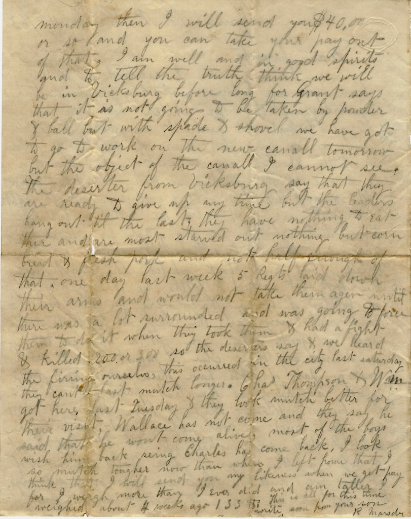I don’t know where we are going to but think we are going to Vicksburg and fight them there after we get done with them here. And from Vicksburg down the river till the thing is settled which all the old soldiers think will be done in a short time. We have got quite a piece of Uncle Sam’s family here, for it covers some 4 miles in a square and numbers about 60 or 70 thousand men.