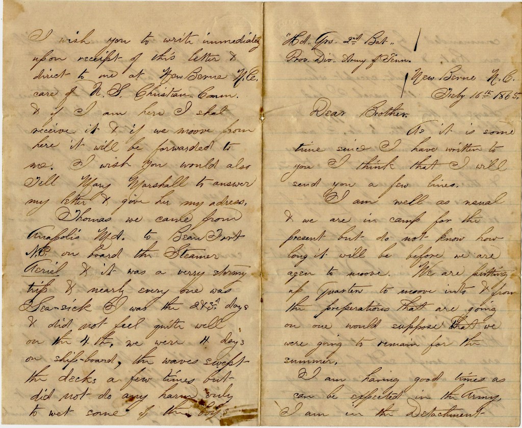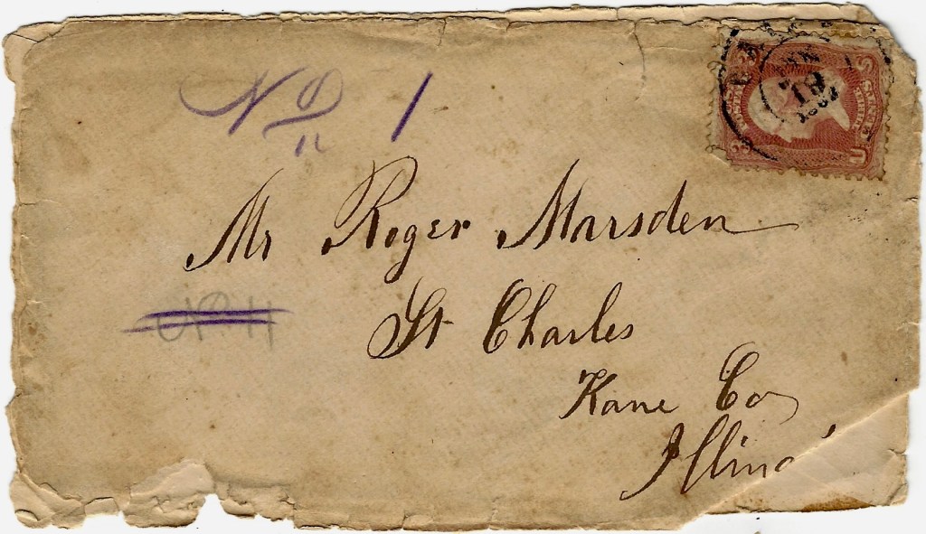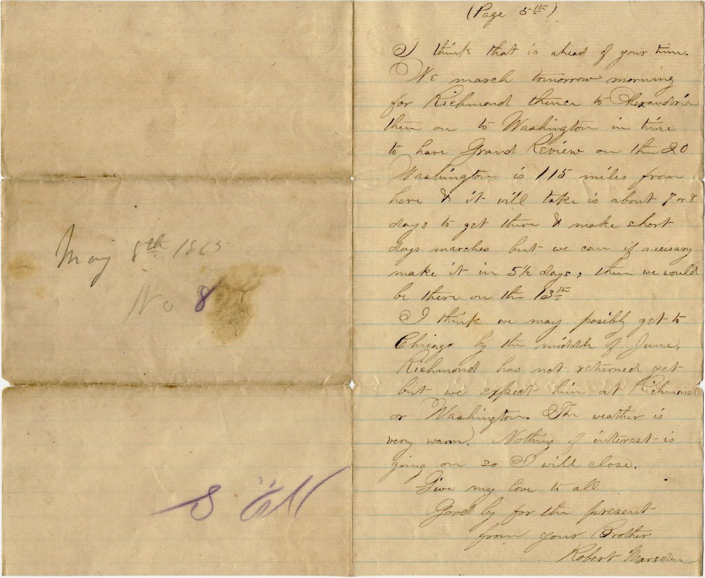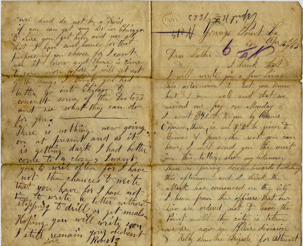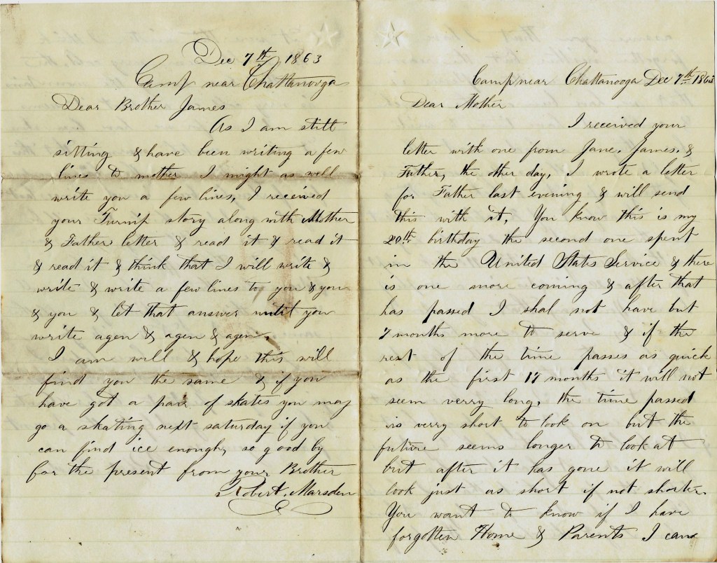 The following 62 letters and an 1865 diary were written by Robert John Marsden (1843–1915) while serving as a private in Co. E, 127th Illinois Infantry. Robert was born in Yorkshire, England, and came to this country as a small boy with his parents, Roger and Elizabeth (Metcalf) Mardsen, and his paternal grandfather in 1845. The Marsden family first settled in Chicago but to escape a cholera epidemic, later relocated to St. Charles in the Fox river in Kane county, Illinois. Robert’s father was a shoemaker by trade, active in his work until his death in 1864.
