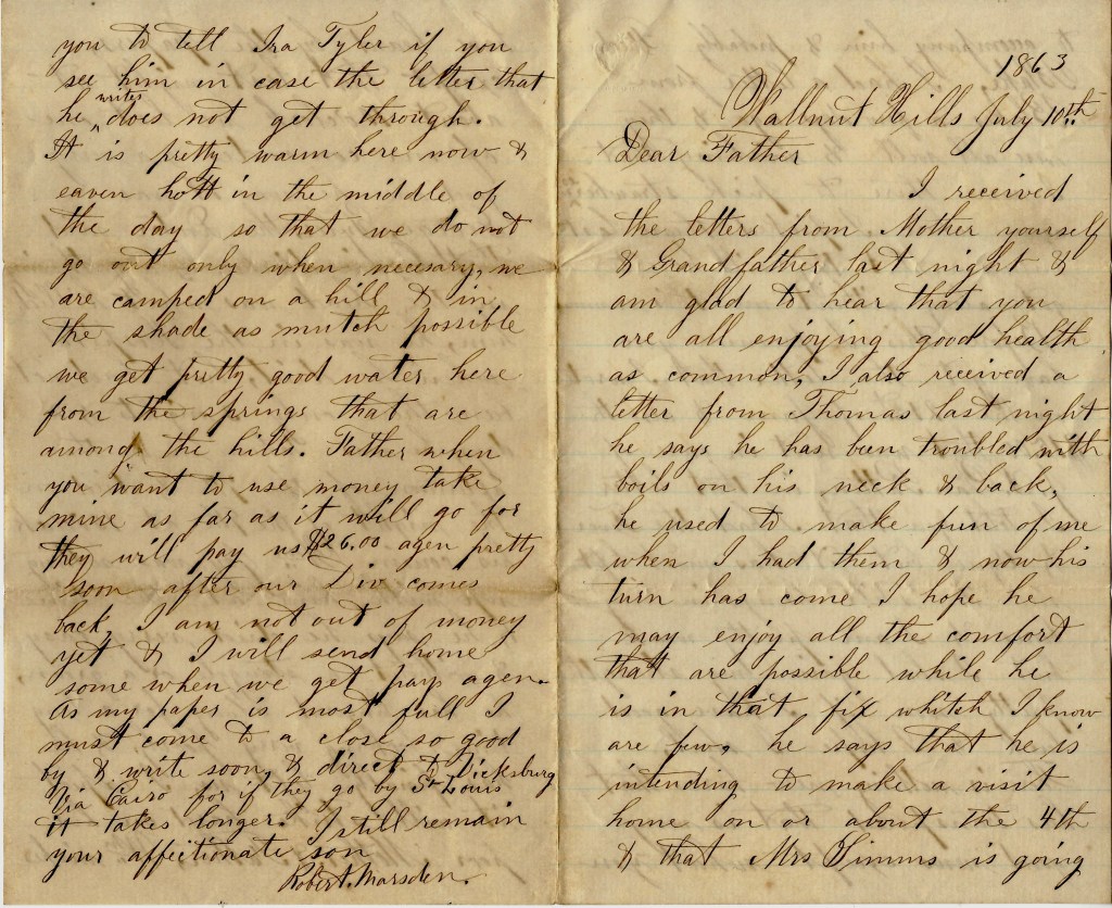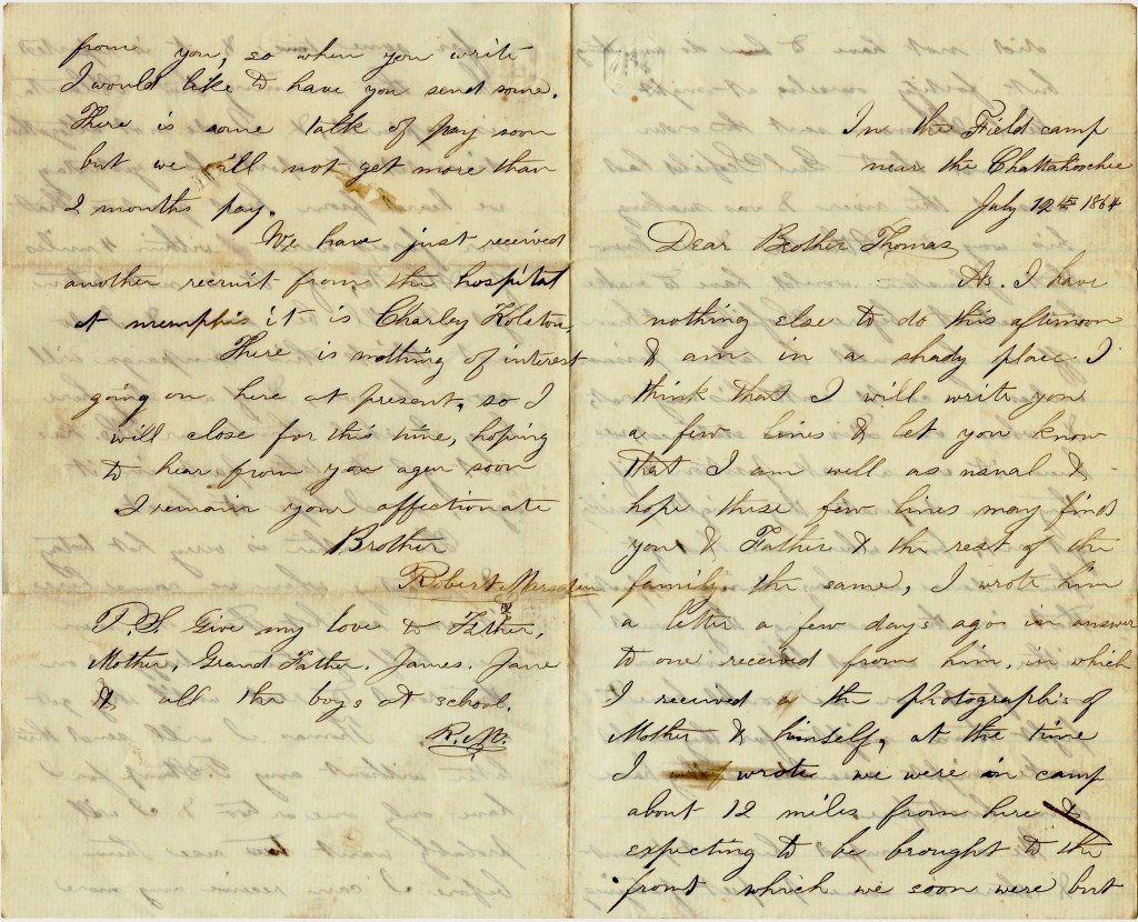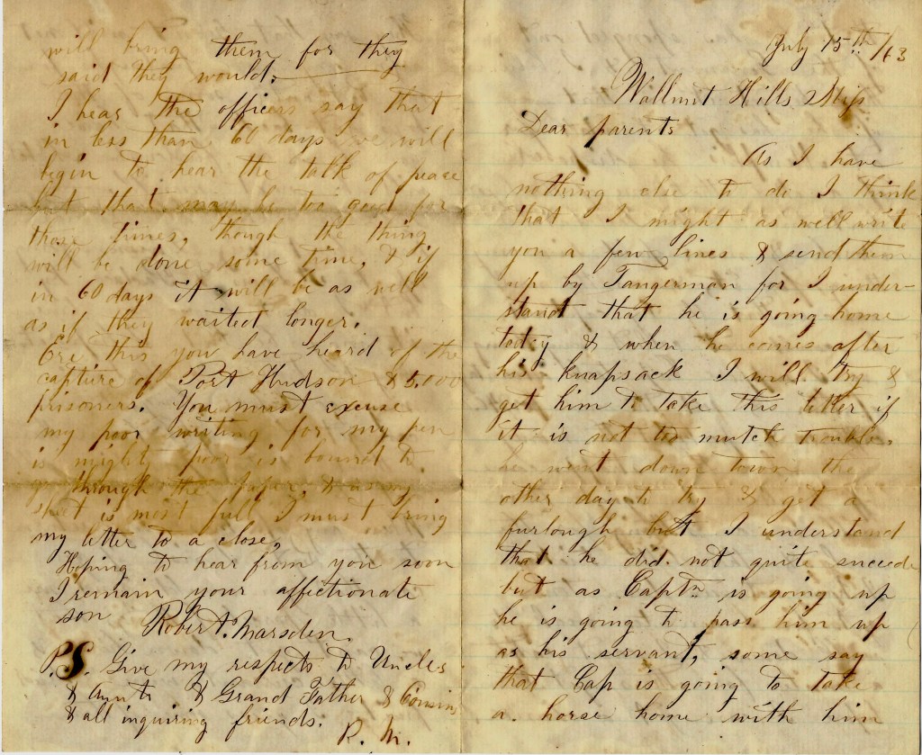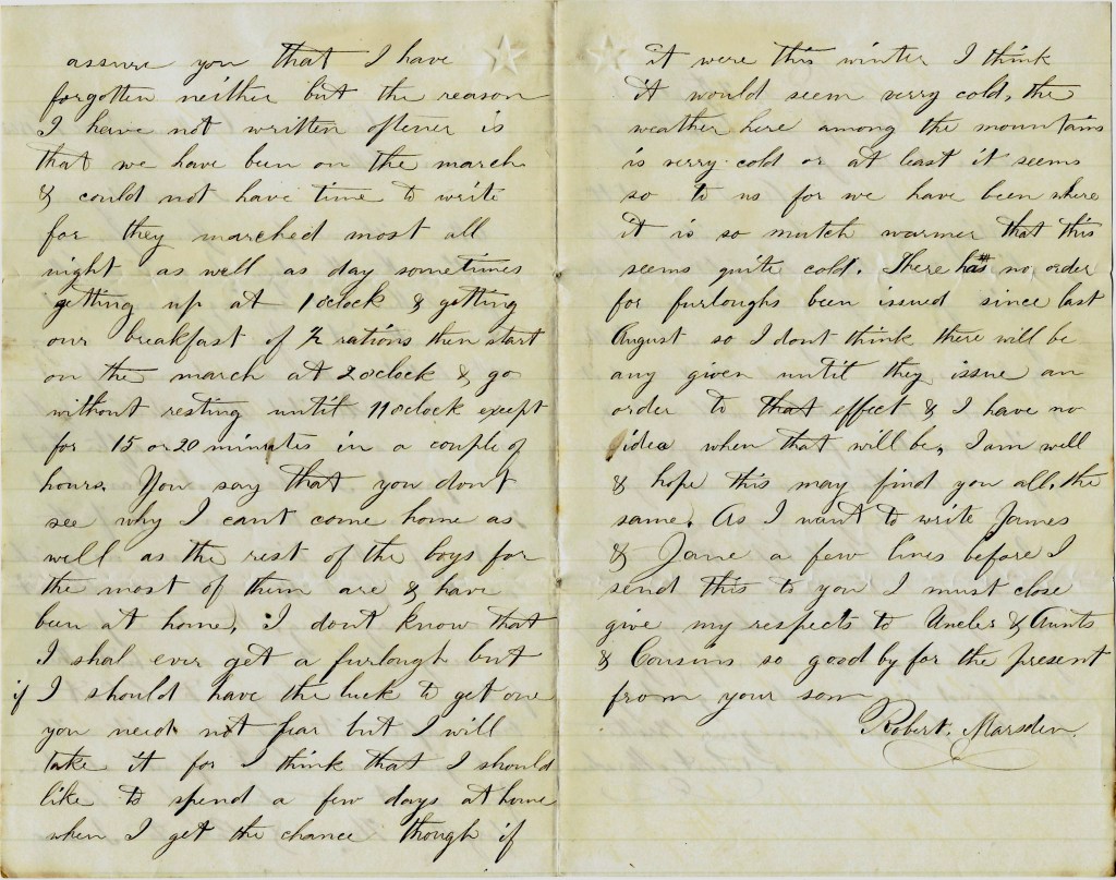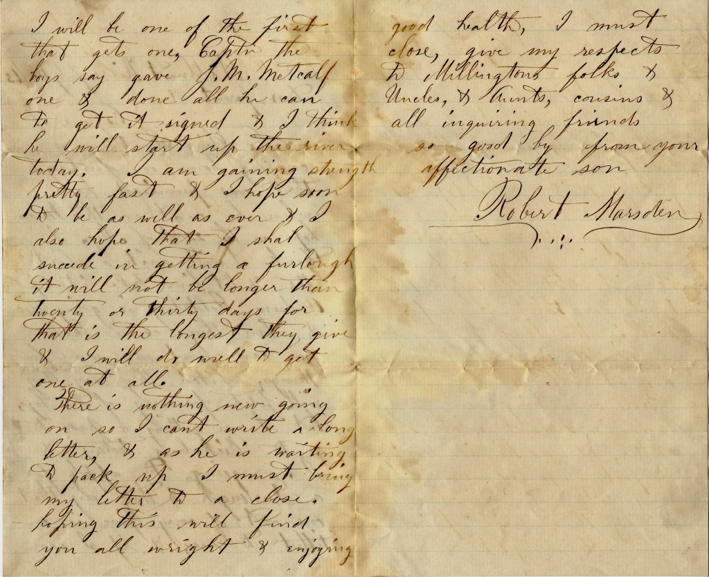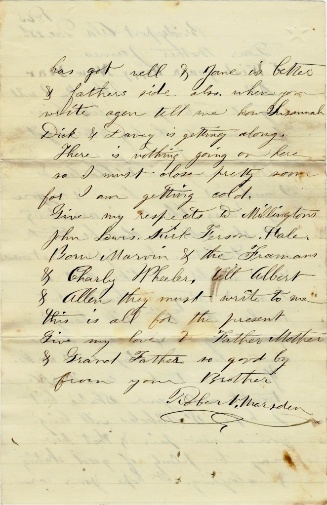 Tell father to send me a few postage stamps if he can when he writes again for I have not got but a few left. And tell Thomas that he must pay Richmond something for things in the trunk, for they will have to pay the freight on the things, and he may have the coat. I have not sent them yet but they will have to send them pretty soon. I can’t think of any more at present so I must close. Sending my love to you all so good night from your brother, — Robert Marsden
