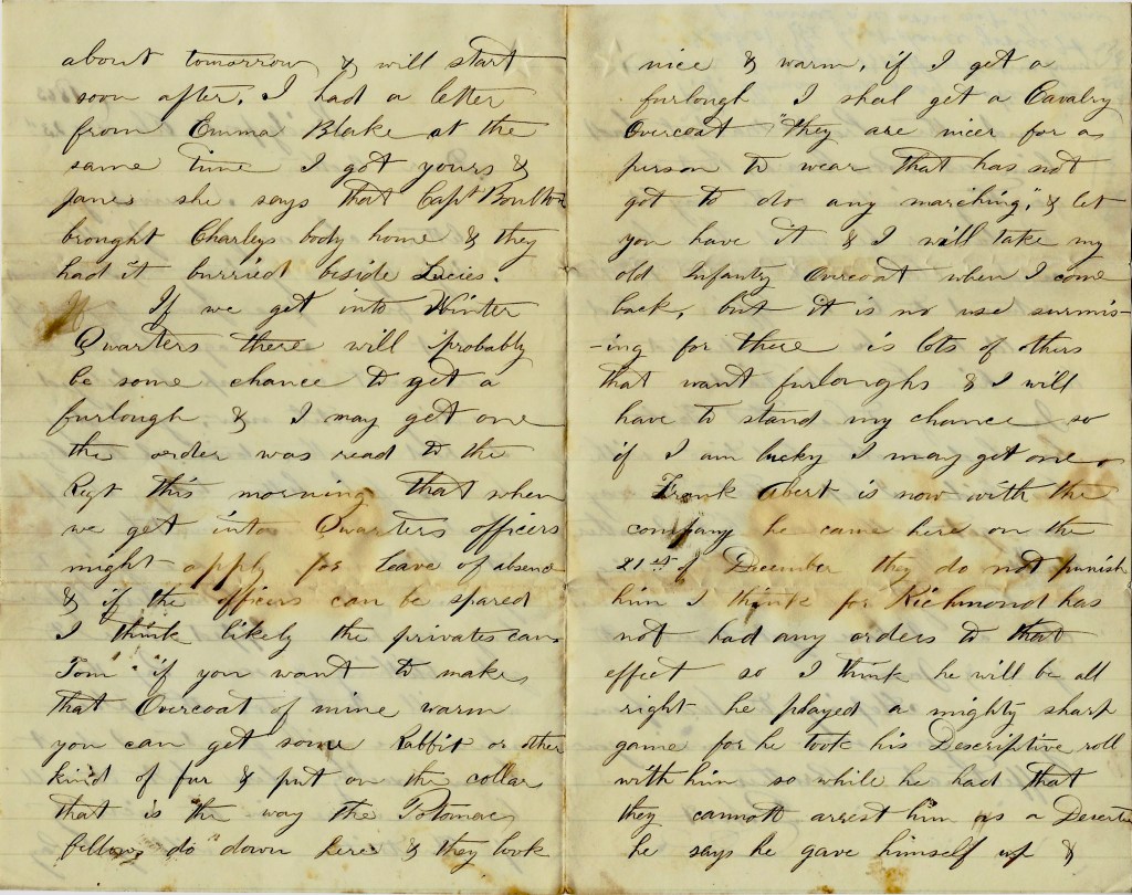 There is a good many of our escort getting sick furloughs. There has three men gone from our company within the last few days. Corporal Crumpton is among the number (you mind he was my mess mate at Murfreesboro). I sent [by him] a couple of relics of the Battle of Chickamauga—one a breastplate which I got from a prisoner on the first day of the fight, and a bullet I picked out of a tree—one day lately that I was out on the battlefield. He is going to leave them in Markle’s Paper Store in Pittsburgh. He said if he was ever through West Newton, he would call and see you.