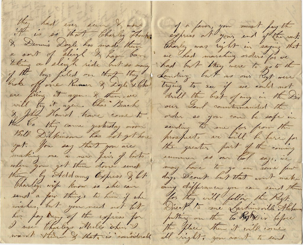 Last night we got into camp about 8 o’clock and got our tents struck when it commenced to rain and blow like a hurricane, and we had all we could do to keep our tent from blowing away. It started some of the stakes, and we held onto the bottom and the center pole. We are in Mississippi, but I don’t know what county. It is pretty warm weather here. There has not been any frost of any account but I suppose that it is pretty good sleighing or skating on Fox River. But sleighing or skating, I had rather be there than here when we have to make the long marches, for the first afternoon they shoved us some 15 miles and that made our feet sore. And some of the boys that paid $6 for a pair of boots traded them for a pair of shoes. But it is muddy today and I am glad I did not do the same. I only took the socks out, and that made them big enough to go easy and then I got along very well.