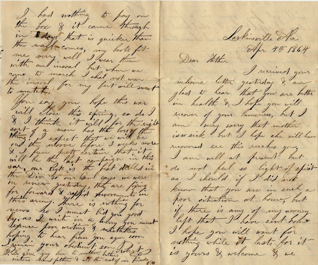 There is no news of any account here at present, but a lot of camp rumors that don’t amount to anything so that I think I will close my letter telling you to direct it as before, via Cairo, 127 Regiment, Co. E. But I have not had a letter yet from home yet. So goodbye from your son, — Robert