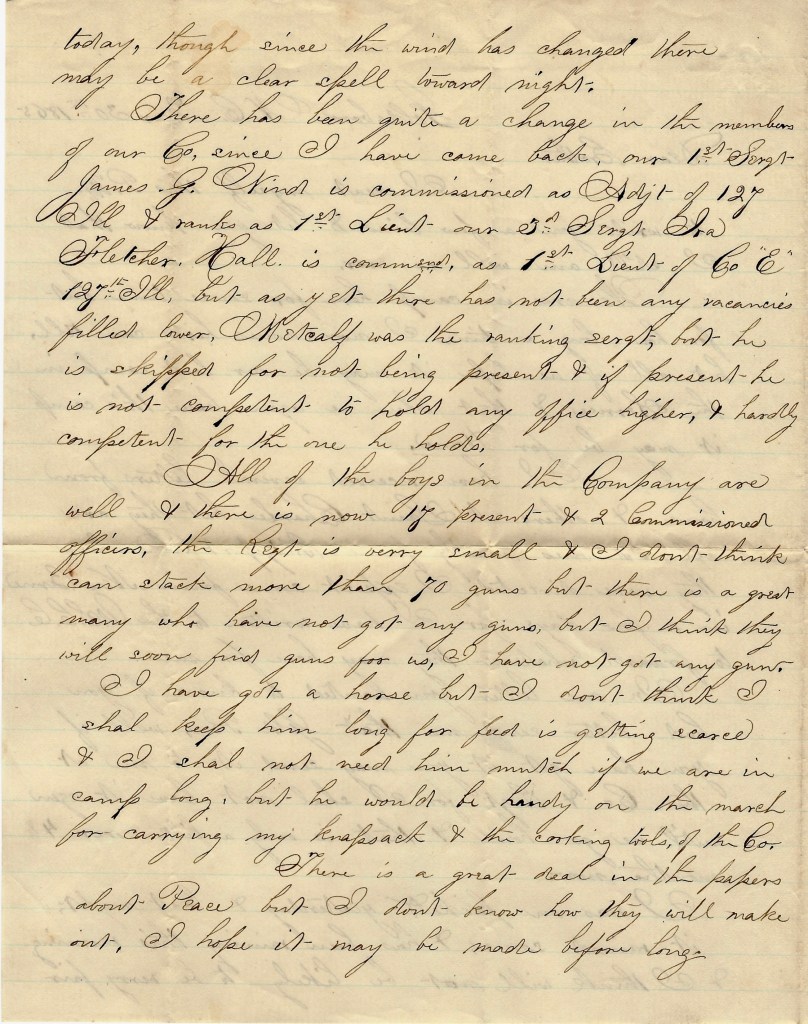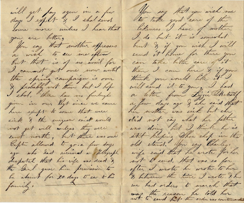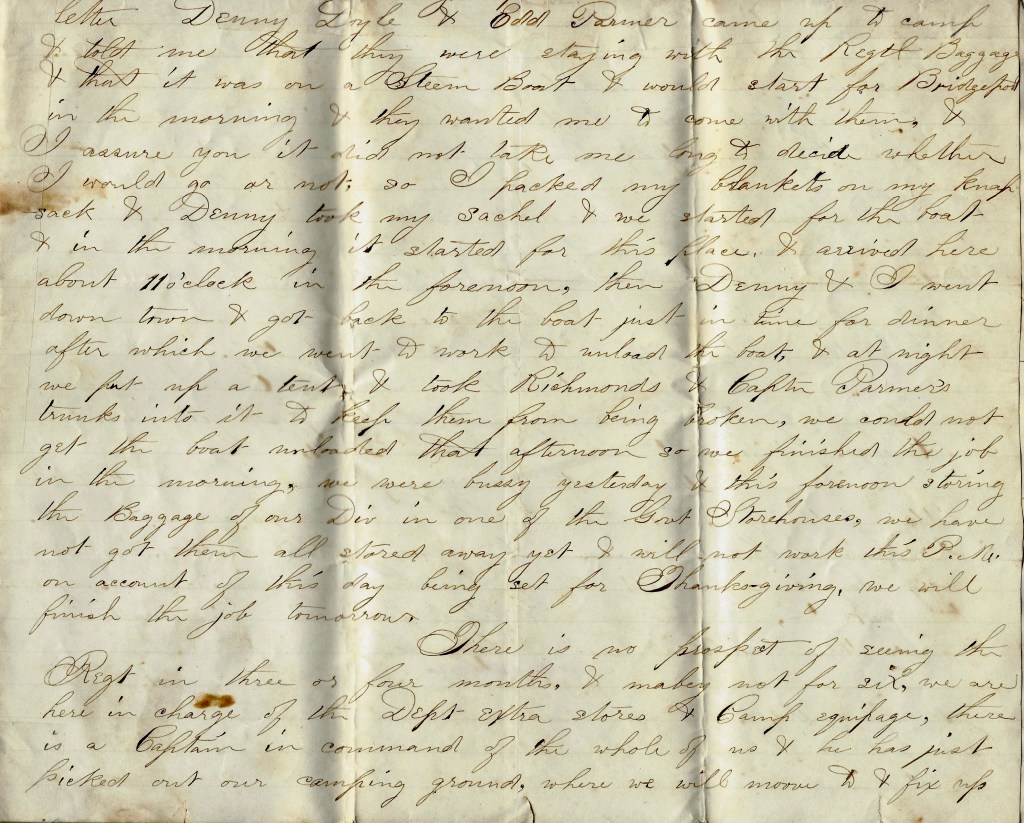 As I now have a chance to send a few lines to you by Dan Tyler, I have not much to tell you but that now that was [ ] in regard to our having [ ] orders… Col. is going to Washington to see about having the regiment go [ ] and getting breach loading rifles and if he does we will not have any marching to do.