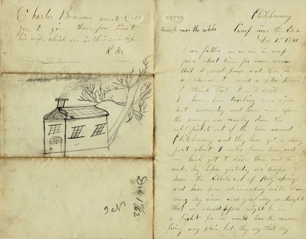 As we are in camp for a short time for some reason that I don’t know and there is a chance to send a letter home, I think that I will write. We have been traveling ever since last Wednesday and have come upon the enemy. Our cavalry drove the Rebel pickets out of the town named Chilohomony and they have got a strong fort about 9 miles from here and we have got to drive them out this week. Day before yesterday our troops drove the Rebels out of Holly Springs and have been skirmishing with them every day since. And yesterday we thought we should before night be in a fight, for we could hear the cannons firing very plain, but they say that they were fighting in the other Division.