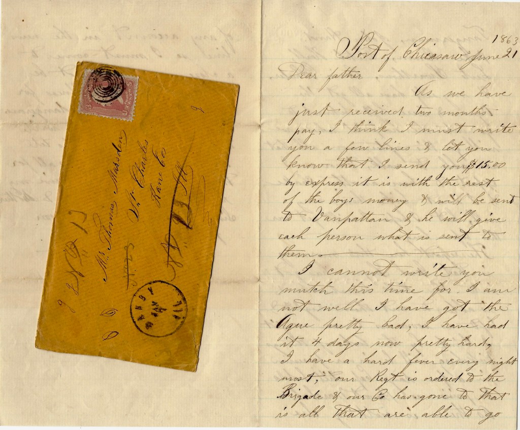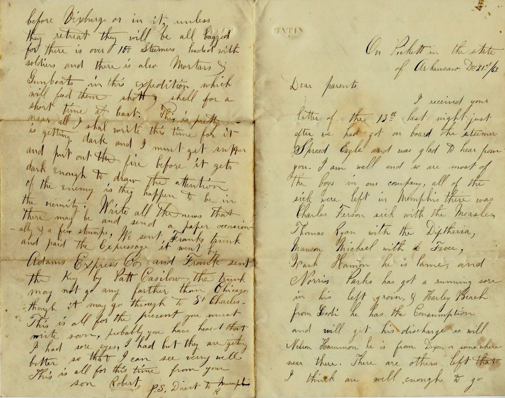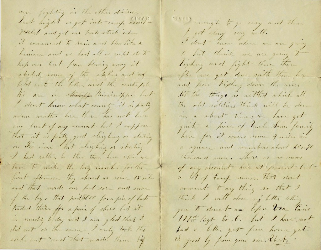 You must direct my letters to Co. E, 127 Regt. Illinois Vol, via Cairo, and then it will follow the regiment for there is a grand distribution office there, and they keep track of the regiments in the West. We don’t know how long we shall stay here. This is enough for now for it has stopped raining, and I am going after a Pig. From your son, Robert