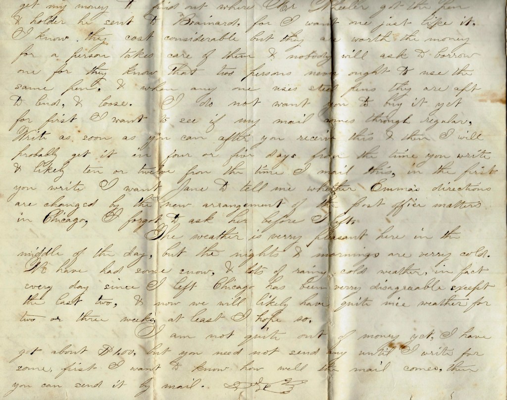 I just received your and father’s & James’ letters this morning, dated the 9th inst. You mentioned the contents of the parcel you intended to send me but did not come. You say that the [Fox] river is frozen and it is good skating and I wish that I was there to share the sport of skating on it, but as I am not, you will have to do it for me. There is a good deal of difference in the weather here and what it is up there. It is pretty cold nights here but nice and warm as spring in the day time. It freezes very little here and is thawed out now.
