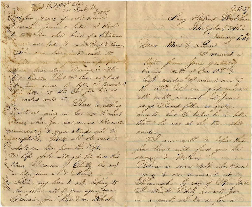 We had a pretty tedious time coming from Washington and were two weeks weeks on the road. We went to Camp Chase, Ohio, where we expected to stay awhile but remained only one day and started for Cincinnati where we stopped two days, giving us a chance to look around the pork metropolis, which is rightly named from the quantity I saw there. From there we took a boat down the Ohio River 150 miles to Louisville, Kentucky, remaining there one day. Then our course lay directly south across the states of Kentucky and Tennessee, passing through Nashville, to Bridgeport. Alabama, from which place we came afoot—a distance of thirty miles. Ohio is a fine state and well cultivated but Kentucky and Tennessee, being equally fine, need Yankee enterprise to make it the finest country in the world. They are about half covered with heavy timber and I hardly saw a frame house and the log houses were miserable things—not as good as our tents. They do not appreciate good buildings or have the ingenuity to build them. And if the ladies I saw are specimens of “southern chivalry,” where else no real beauty and symmetry is found. I think the sooner they are got rid of the better for as the boys say, they will all firk. One of the “chivalry” said, “we’ens think it no harm down here, as you’ens do.”