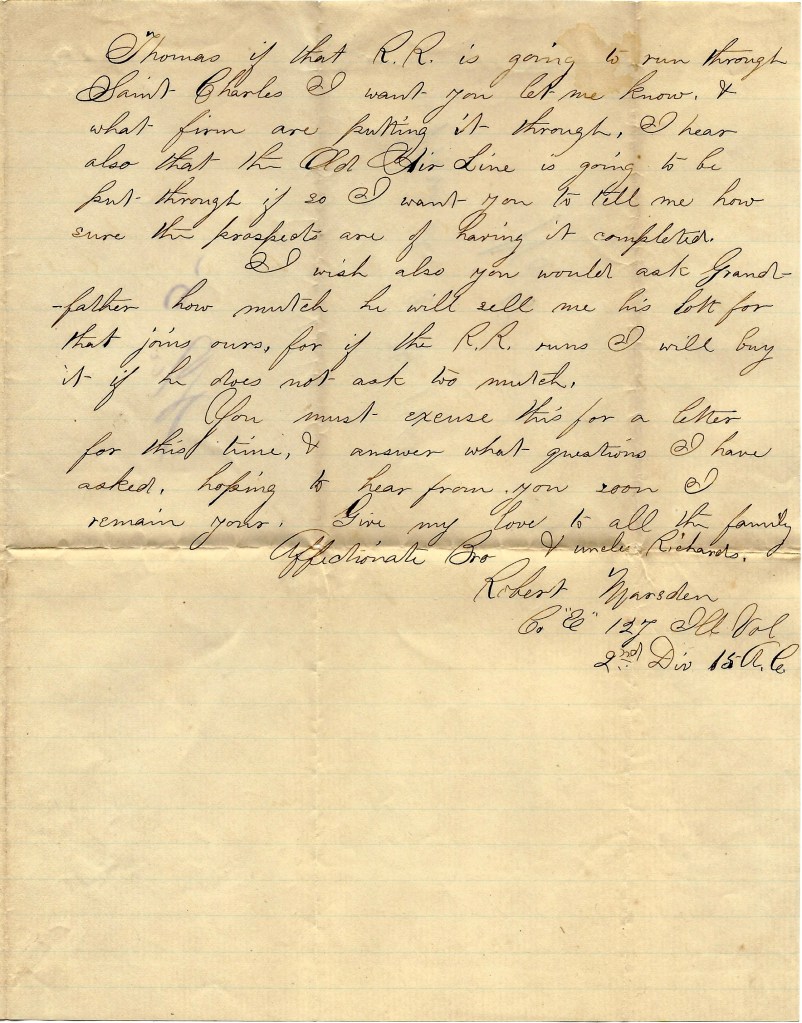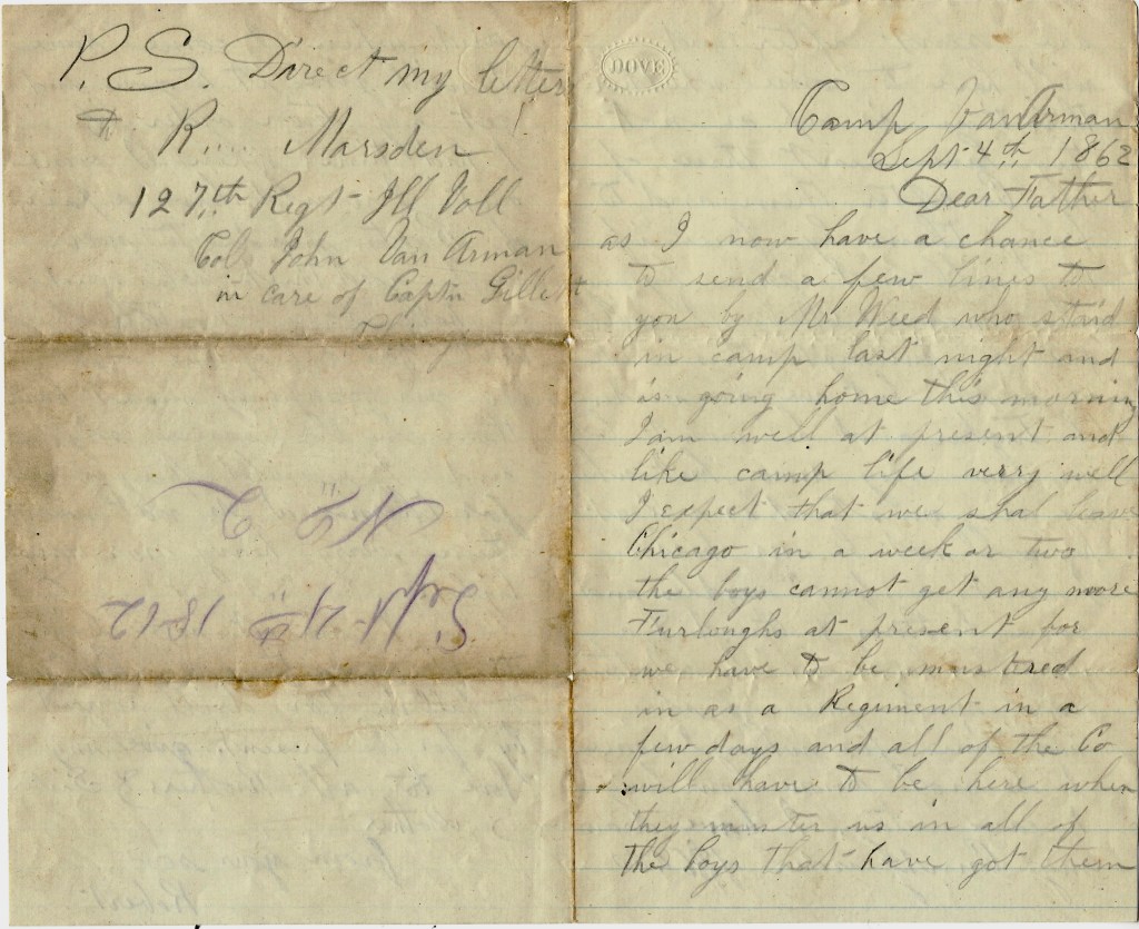 P. S. Direct my letters to R. Marsden 127th Regt. Illinois Vol., Col. John Van Arman, in care of Captain Gillette, Chicago