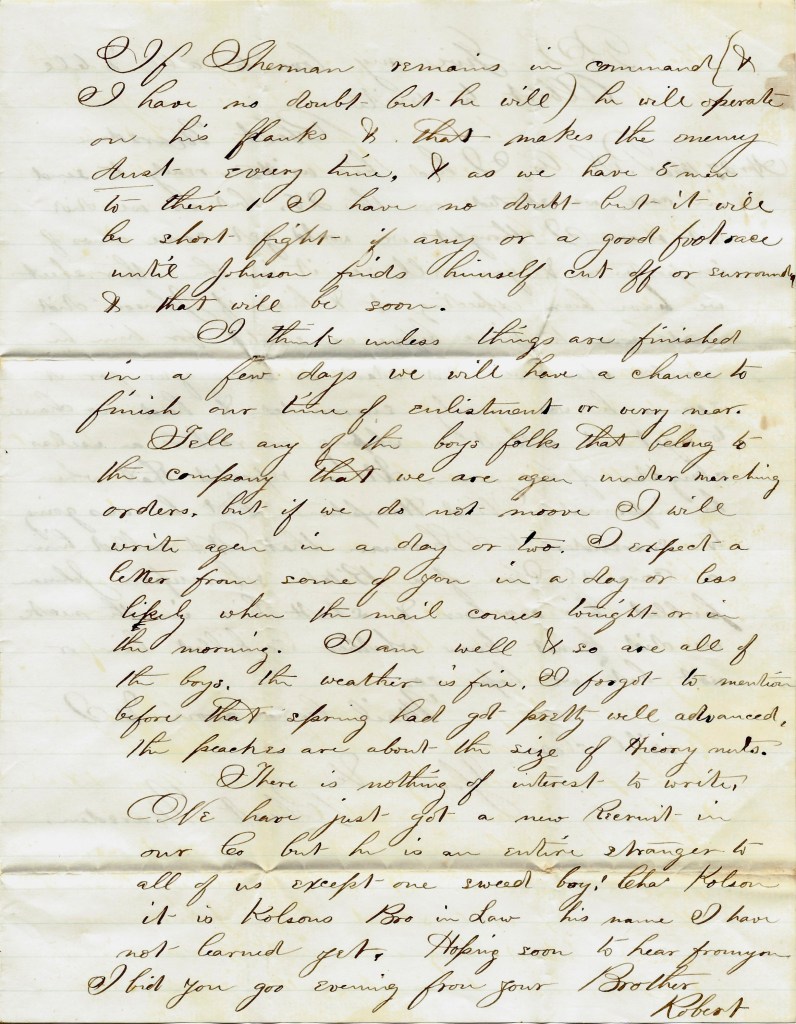 This morning is cool as usual. [Robert wrote the following but crossed it out: “The 20th A.C. moved on towards Johnston this morning, also the 17th A.C.”] There is a small mail, but none for me. We have received Chicago papers of the 15th. This evening I am detailed for chain guard tomorrow. The weather is fine as usual & all are well.
