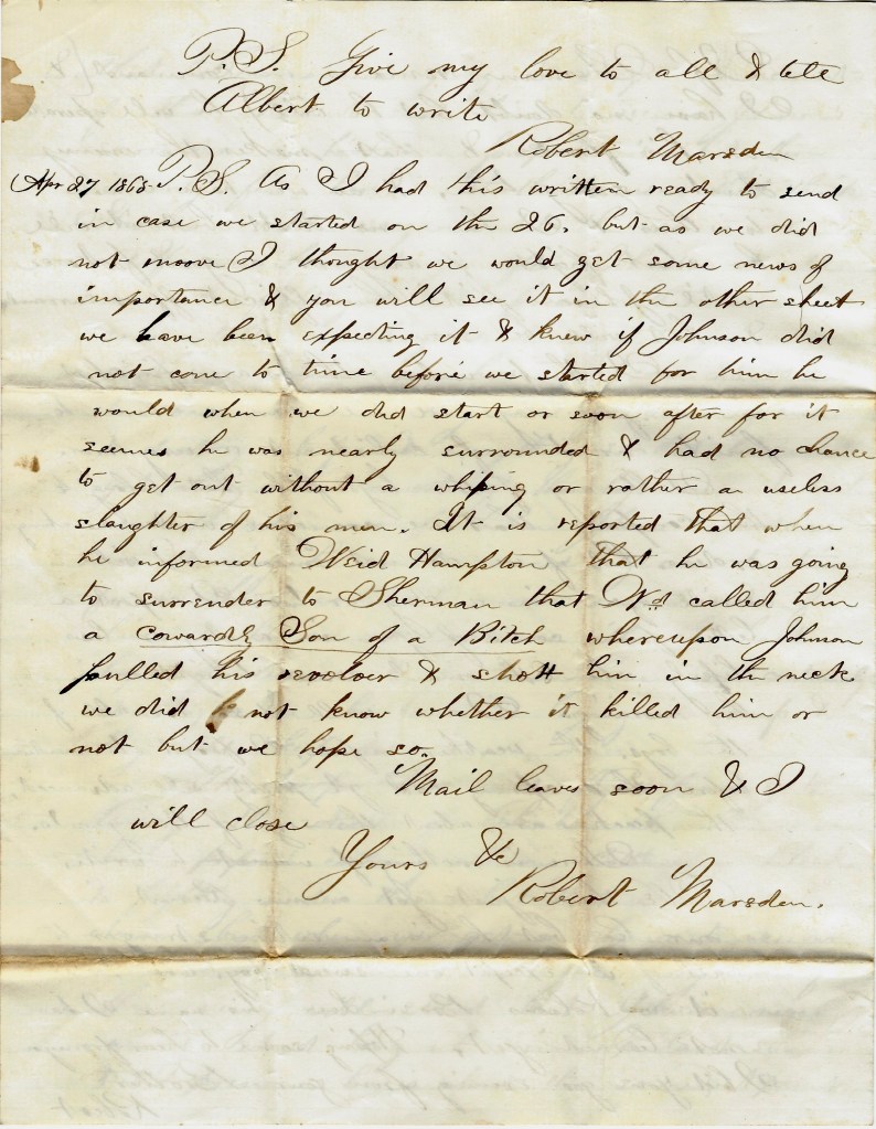 I am on guard duty from 8 o’clock until the same hour tomorrow. We have received the notice of Johnston’s surrender to Sherman. We expect to move in a few days for Washington or some other place where we are to be mustered out, so we have an idea. Tonight the troops are very wild, firing guns & making all sorts of noise. They kept it up until after 10 o’clock p.m. There has been several rockets fired tonight from Hd. Qtrs. of A. C.
