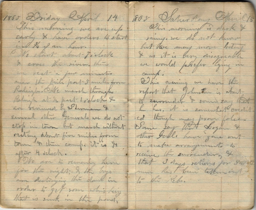 This morning is cloudy for it rained very hard last night. We got into camp for breakfast about 6 o’clock. We have got some papers & they are deeply tomed in mourning for the death of President Lincoln, which when we first heard, we hoped might prove untrue. The sun has come out, clear & hot. We go about 1 mile and back [with] some boards to make our shanty with. There is a heavy guard around camp & we smell the rat. There is something big in the wind, for there is strict orders against foraging & guards to take all mules & horses. They also send guards out into the country for protection of citizens. Peace is near.