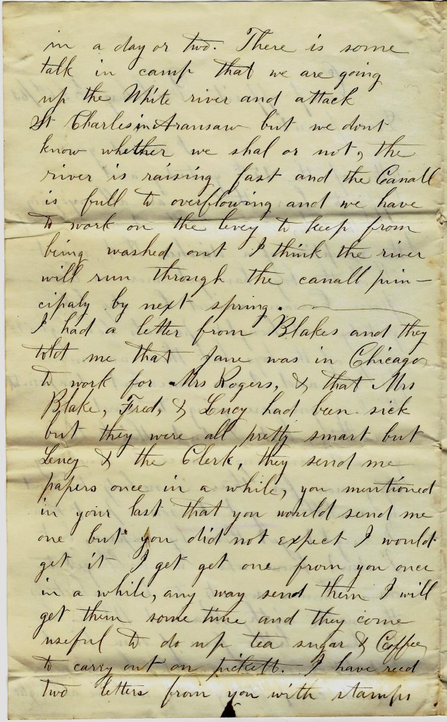 I have not had any letter from home yet. I don’t know what the matter can be, but there has not been but one mail since we left Memphis. But we will have one in a few days. You must direct to Co. E, 127th Regt Illinois Vol., Stewart’s Brigade, Sherman’s Division, via Cairo. That is all for this time. Write soon.