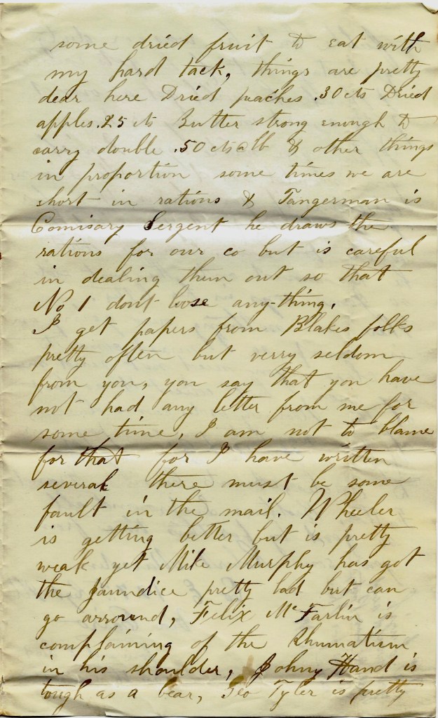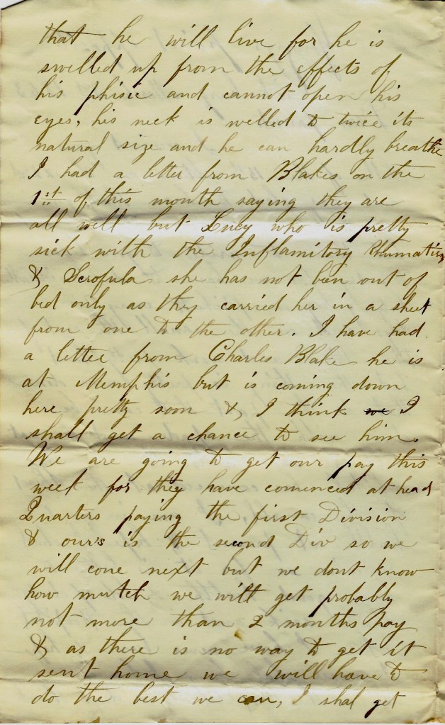 I am pretty well today but not very strong. I was sick abed last week at Blake’s from Tuesday night til last Monday. I did not leave my room from Wednesday til Sunday. I had the Bilious Fever & Bloody Dysentery which the doctor said was brought on by drinking too much water when in a sweat. The doctor charged $2.88 for visits and medicine. Emma wrote a letter to Father last Thursday and I expected that Mother would be in Sunday but she did not come. I think that you did not get the letter. I came down to camp last Tuesday to get a furlough but could not. I will get one this week if I can, but as I am on guard today I cannot get one today.
